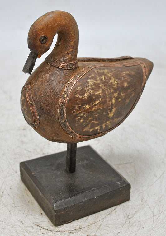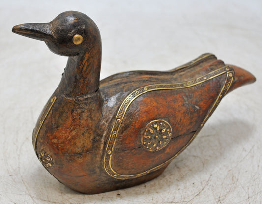 Vintage Wooden Duck Bird Figurine Original Old Hand Carved Brass Fitted