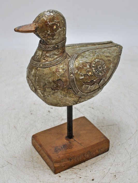 Vintage Wooden Duck Bird Figurine Original Old Hand Carved Metal Fitted