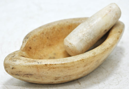 Antique White Marble Oval Spice Grinding Bowl Original Old Hand Carved