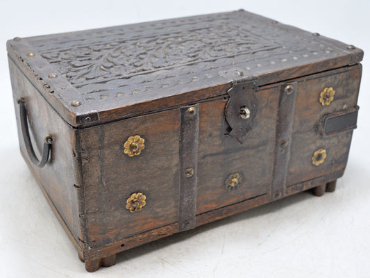 Antique Wooden Storage Chest Box Original Old Hand Crafted Carved Metal Fitted