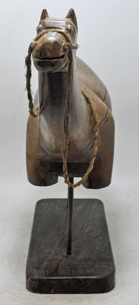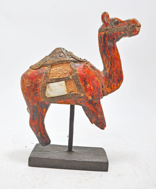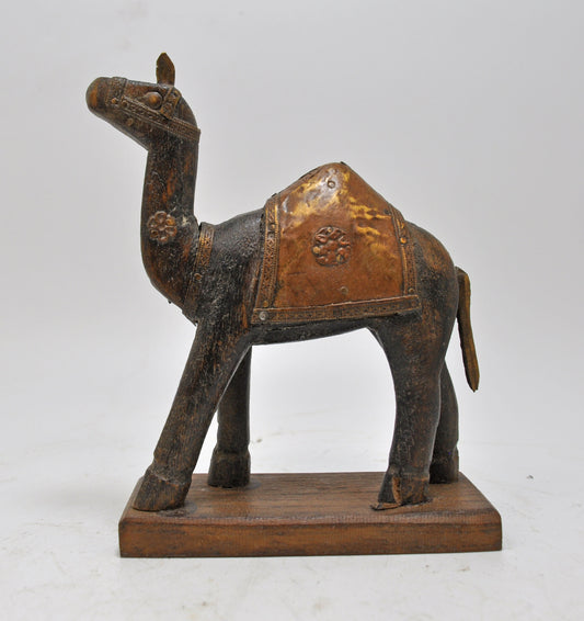 Vintage Wooden Camel Figurine Original Old Hand Carved Metal Fitted
