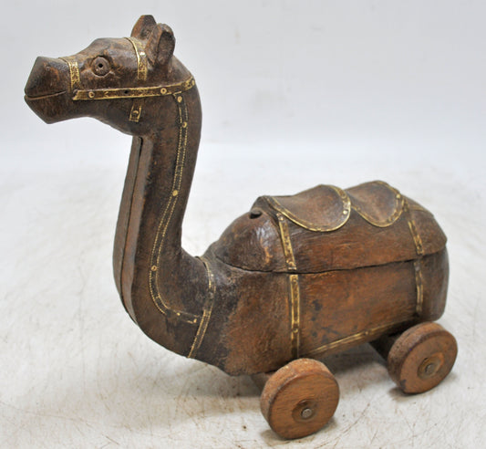 Vintage Wooden Camel on Wheels Figurine Spice Box Hand Carved Brass Fitted