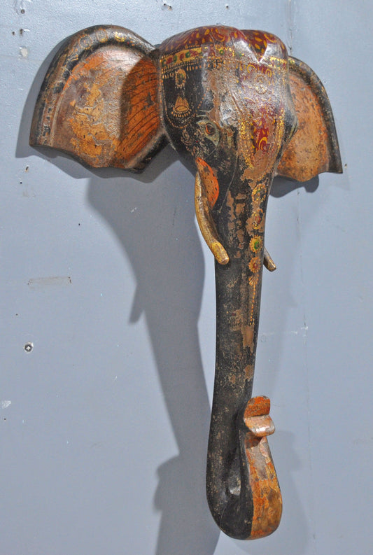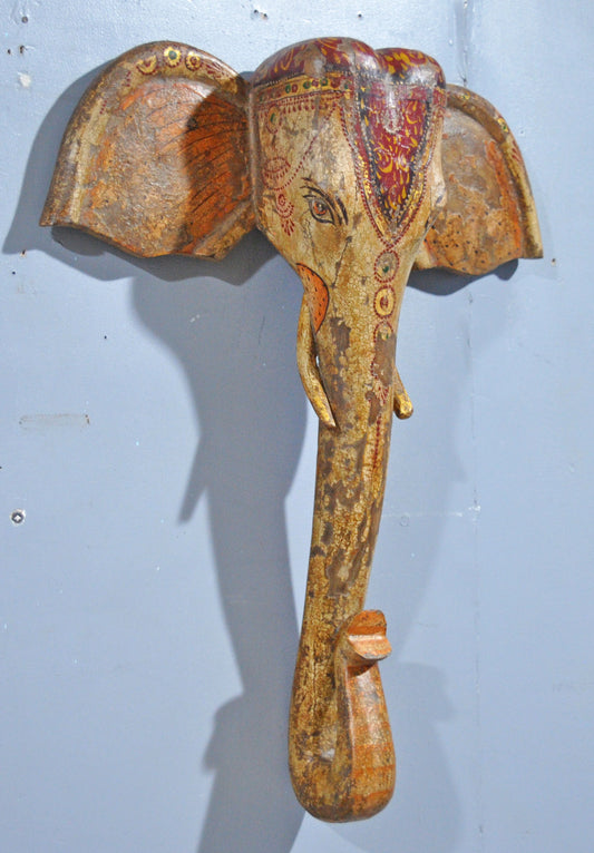 Hand Carved Wooden Wall Décor Elephant Head Bust Figurine Fine Hand Painted