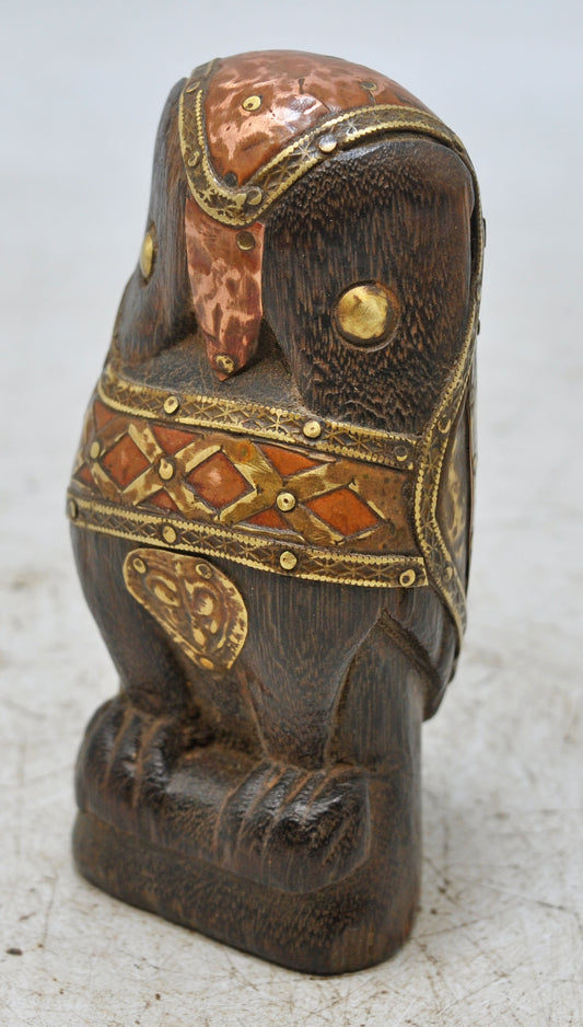 Vintage Wooden Owl Figurine Original Old Hand Carved Brass Fitted