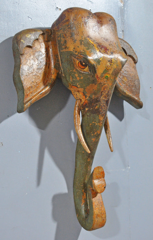 Hand Carved Wooden Wall Décor Elephant Head Bust Figurine Fine Hand Painted