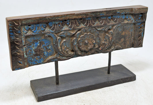 Hand Carved Wooden Flower Carving Panel Plaque on Stand Rustic Blue Painted