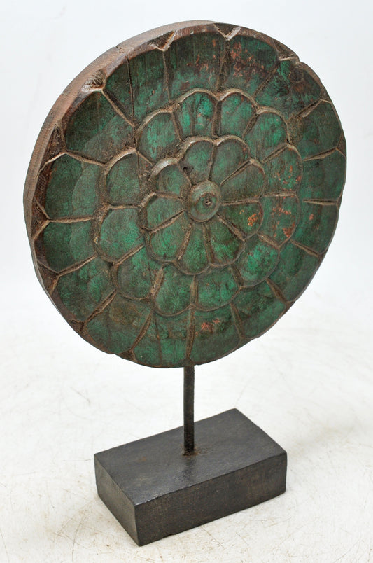 Hand Carved Wooden Flower Carving Panel Plaque on Stand Rustic Green Painted