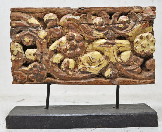 Antique Wooden Floral Carving Panel Plaque Original Old Hand Carved Polychrome