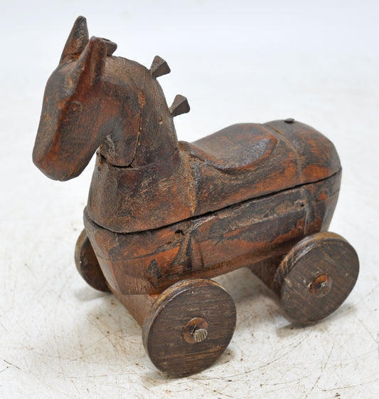 Vintage Wooden Horse on Wheels Figurine Spice Box Original Old Hand Carved
