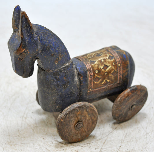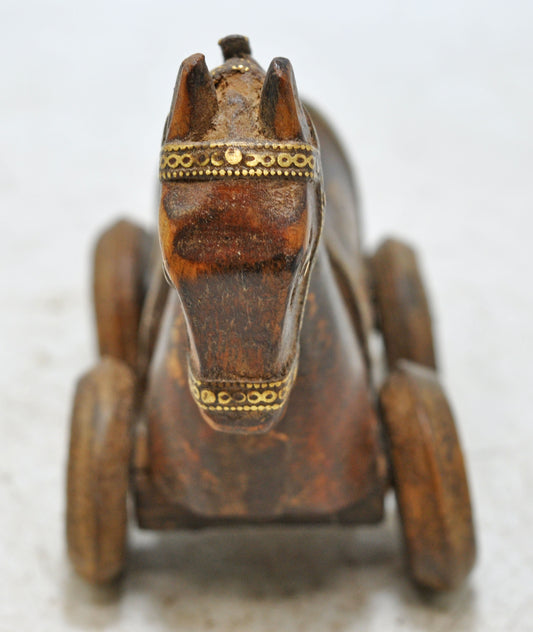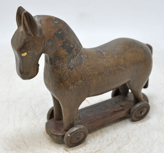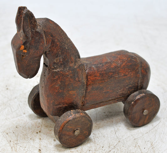 Vintage Wooden Small Horse on Wheels Figurine Original Old Hand Carved