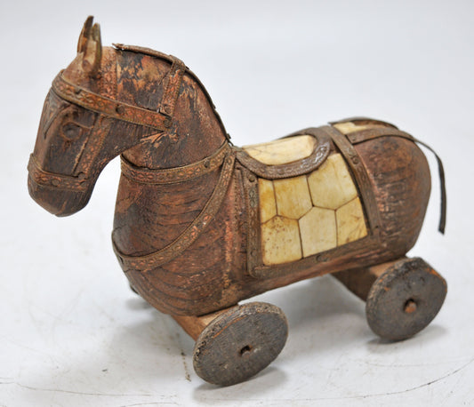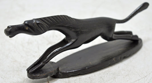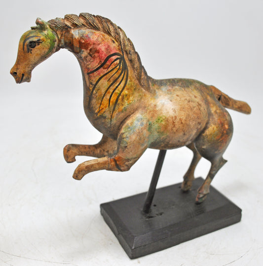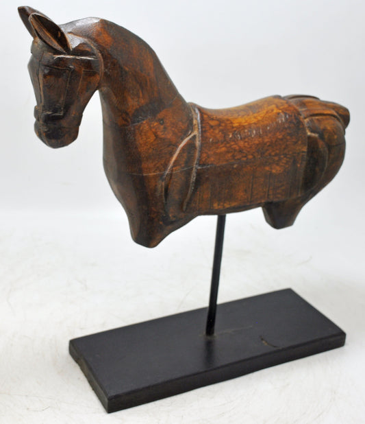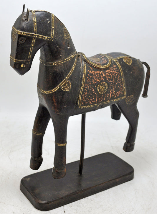 Vintage Wooden Horse Figurine on Stand Original Old Hand Carved Metal Fitted
