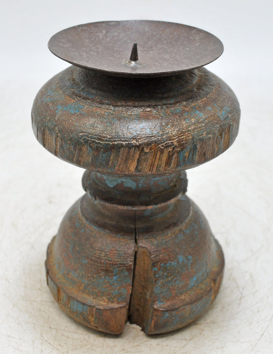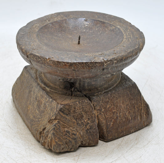 Antique Wooden Heavy Pillar Base Candle Holder Original Old Hand Carved