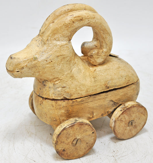 Vintage Wooden Goat Ram Figurine on Wheels Original Old Hand Carved