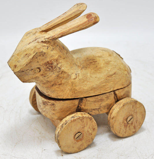 Vintage Wooden Rabbit Figurine on Wheels Original Old Hand Carved