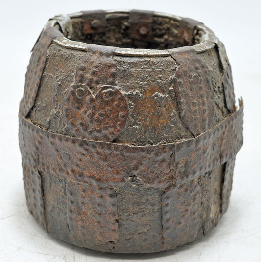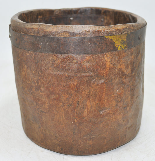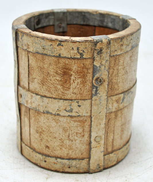 Antique Wooden Early Measuring Pot Paili Original Old Hand Carved Metal Fitted