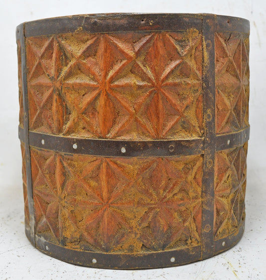 Vintage Wooden Round Grain Measurement Pot Mana Original Old Carved Metal Fitted