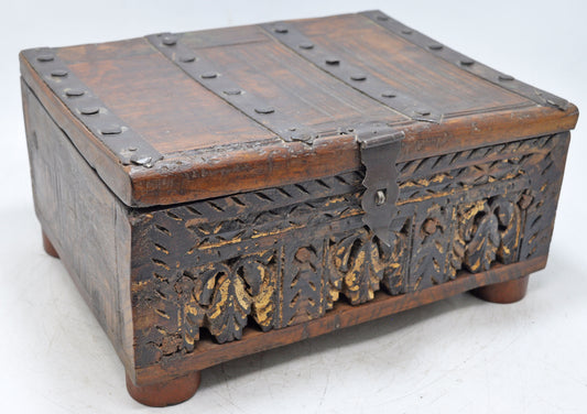 Antique Wooden Treasure Chest Box Original Old Hand Carved Metal Fitted