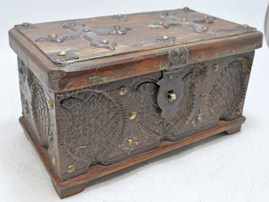 Antique Wooden Storage Chest Box Original Old Fine Hand Carved Metal Fitted