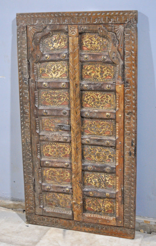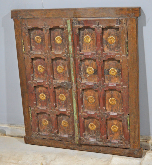 Antique Wooden Large Window Frame With 2 Panels Original Old Fine Brass Metal Fitted