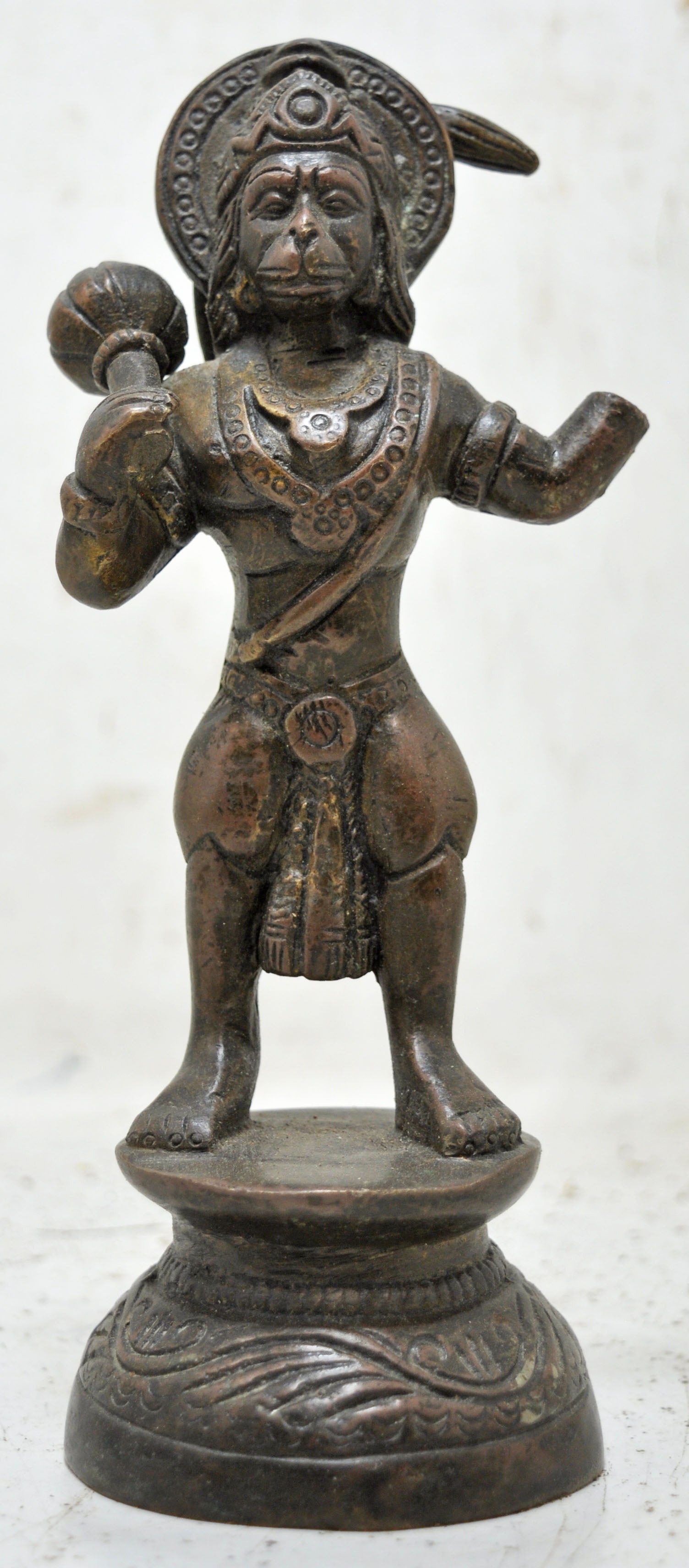 A beautiful old brass idol of Hindu god Hanuman, hoding his weapon 'Gadha'. Hand crafted in a nice shape and very fine detailed. Good condition and a rich patina. Origin India.