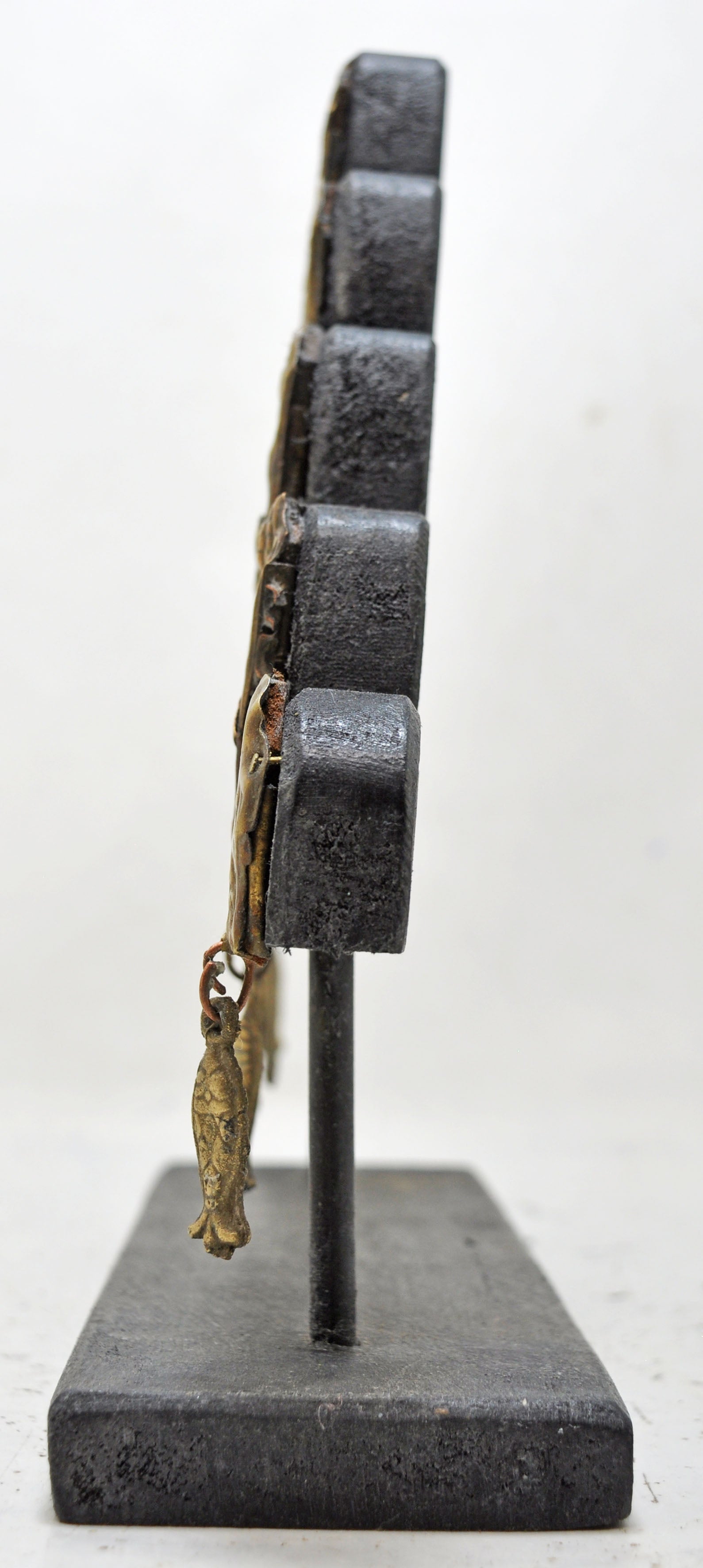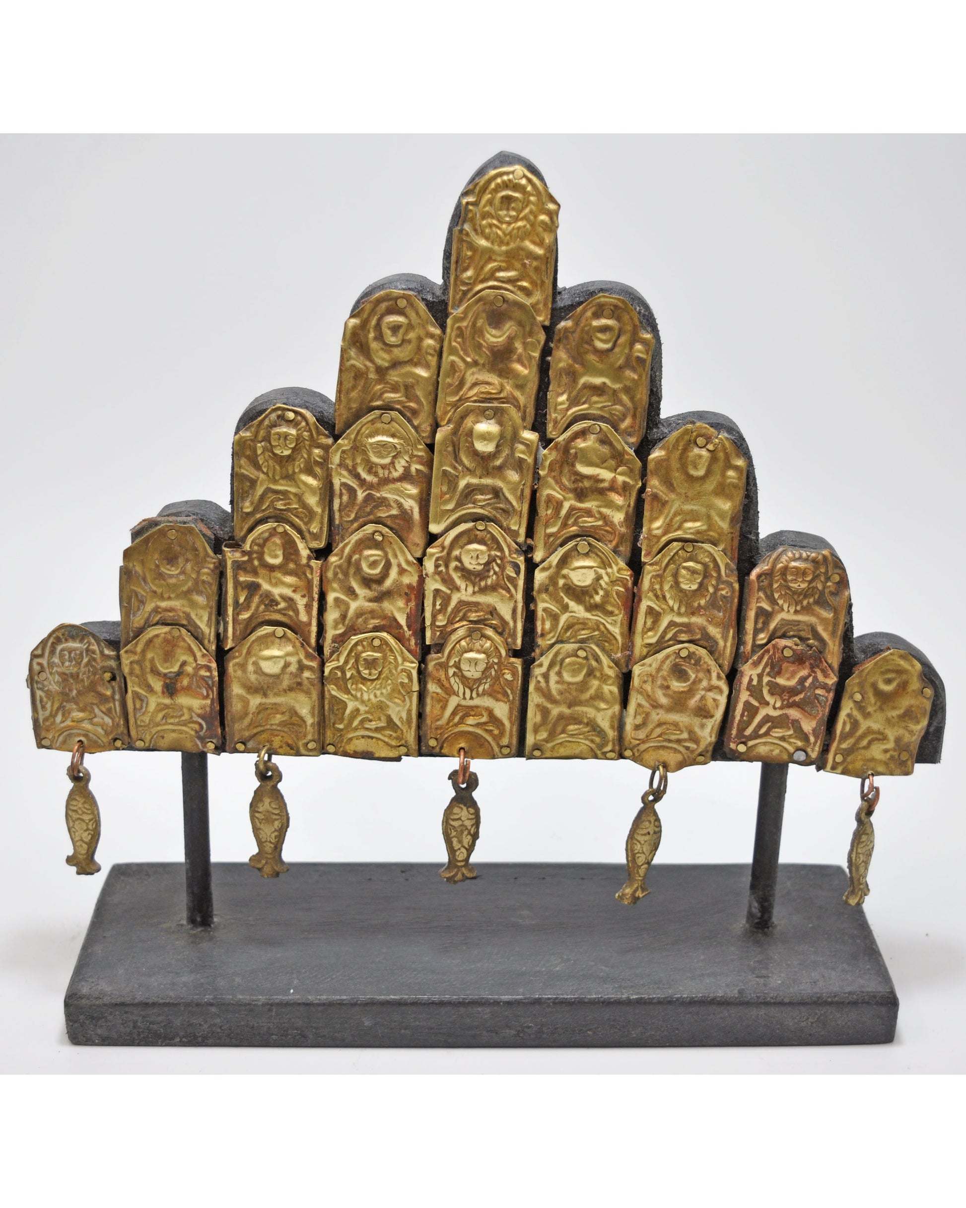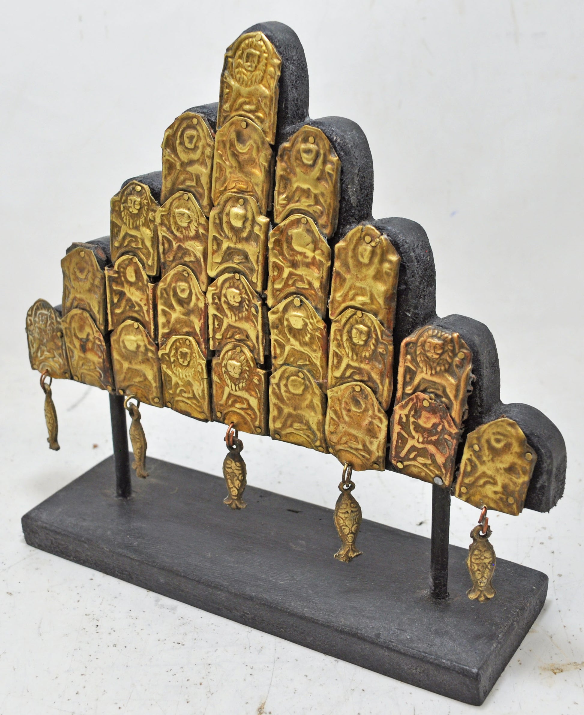 A beautiful old brass panel originally used as jewellery on wedding horses. Very fine quality piece with heavy embossing. Crafted with a wooden panel and stand to make as a decorative piece. Good condition and a rich patina. Origin India.