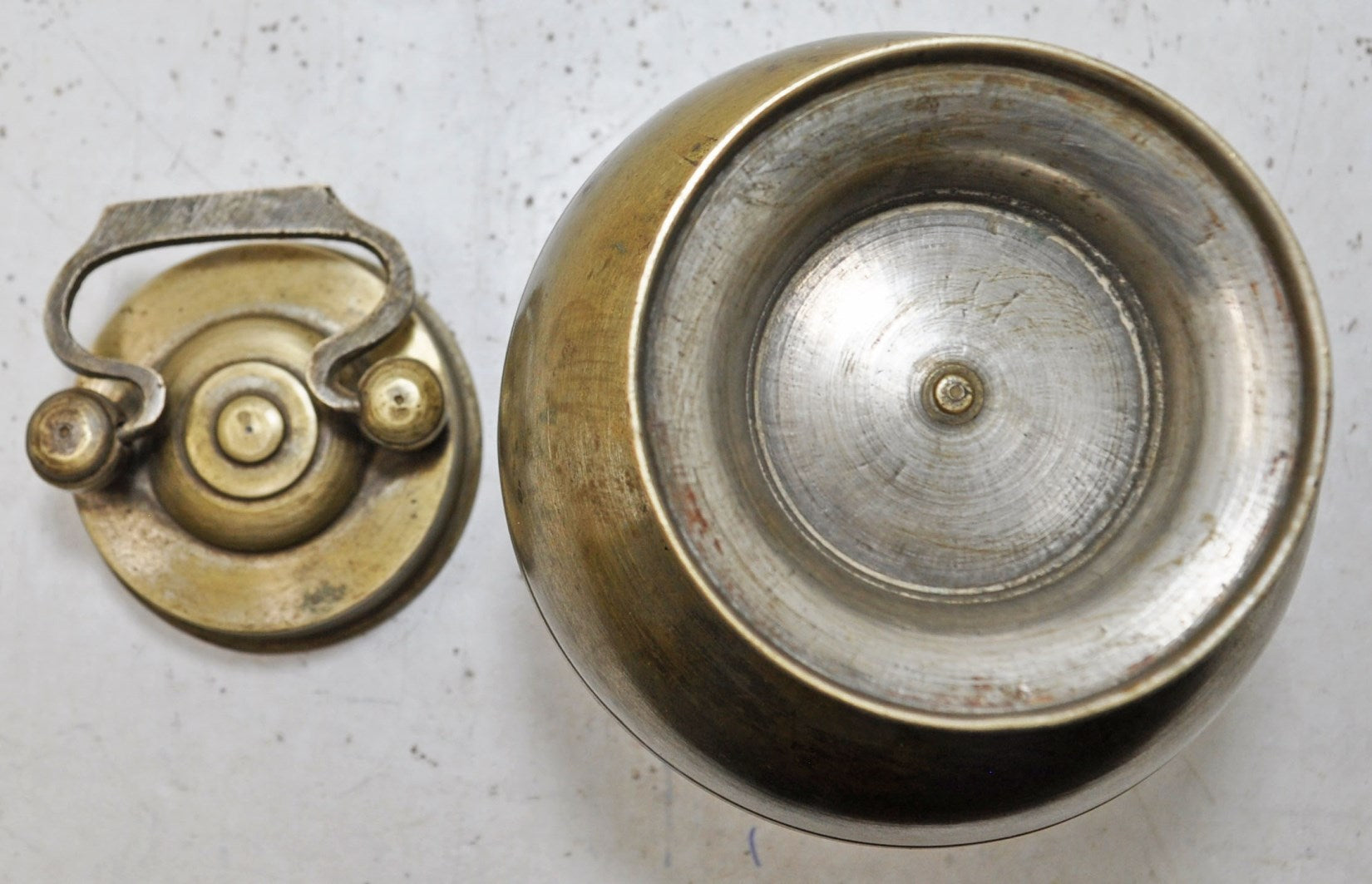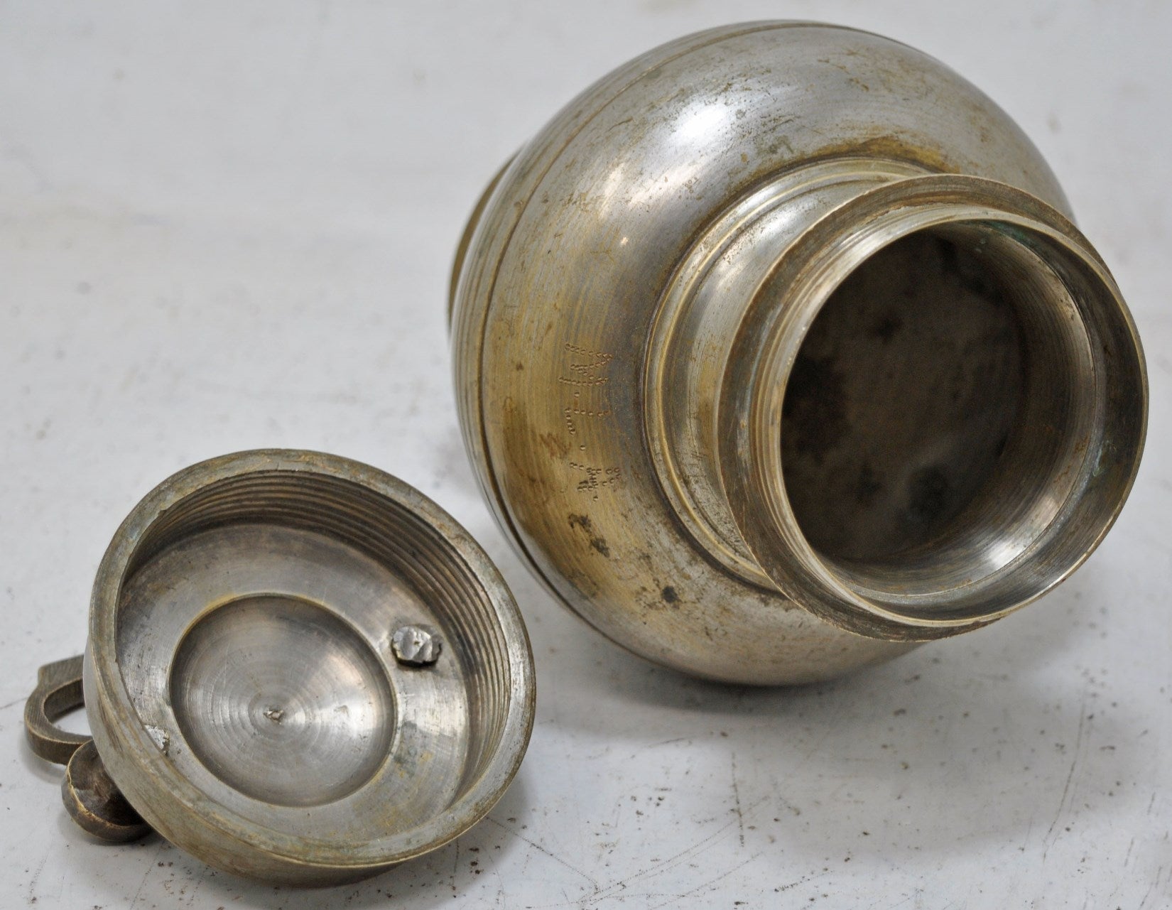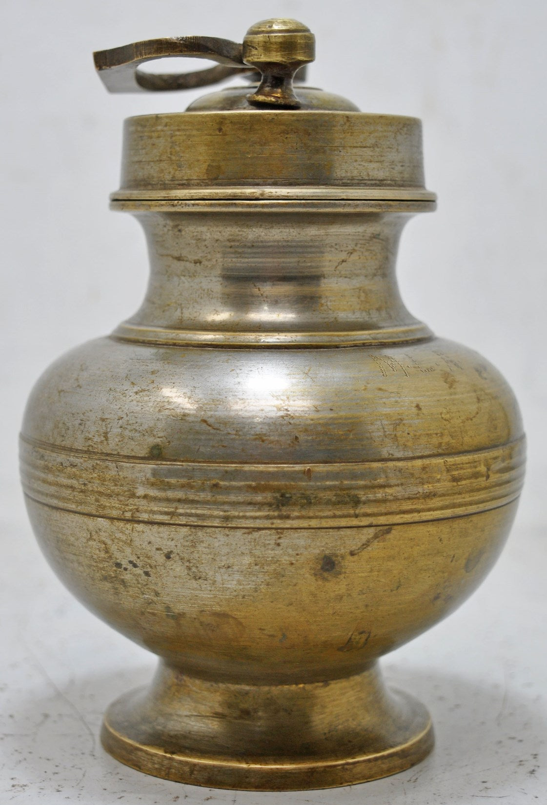 A nice looking old brass pot with cap, originally used by holy men for storing holy water. Hand crafted in a nice shape. Good condition and a rich patina. Origin India.