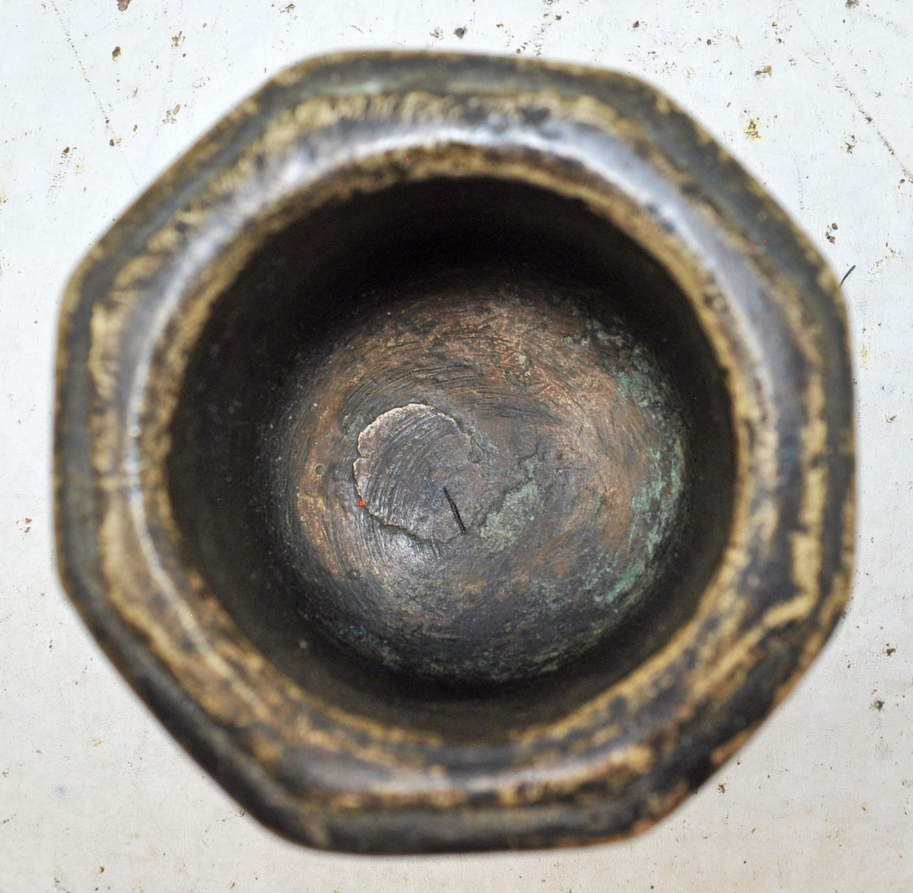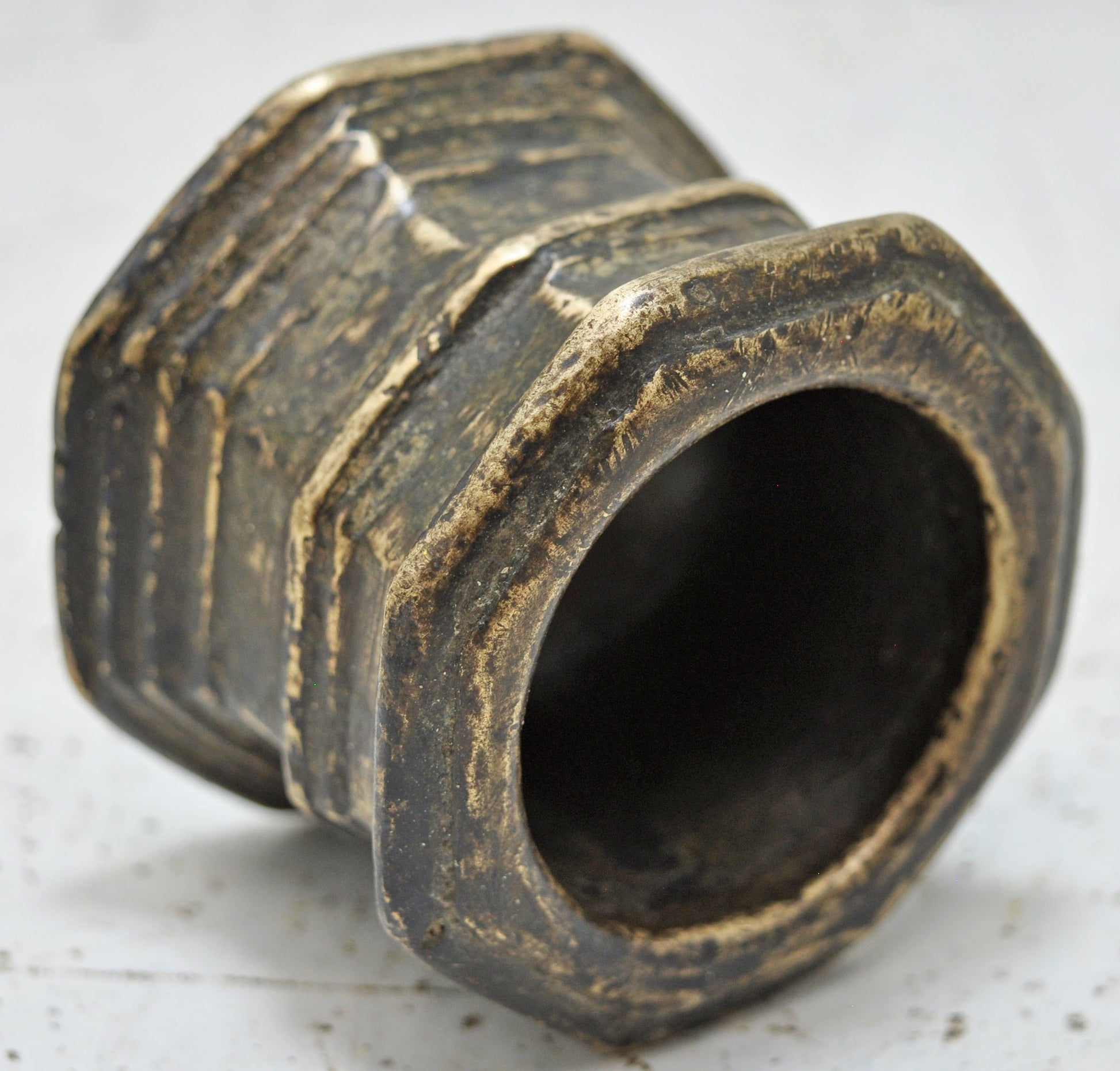 A nice looking old wooden small size brass pot. Hand crafted in a nice shape. Good condition and a rich patina. Origin India.