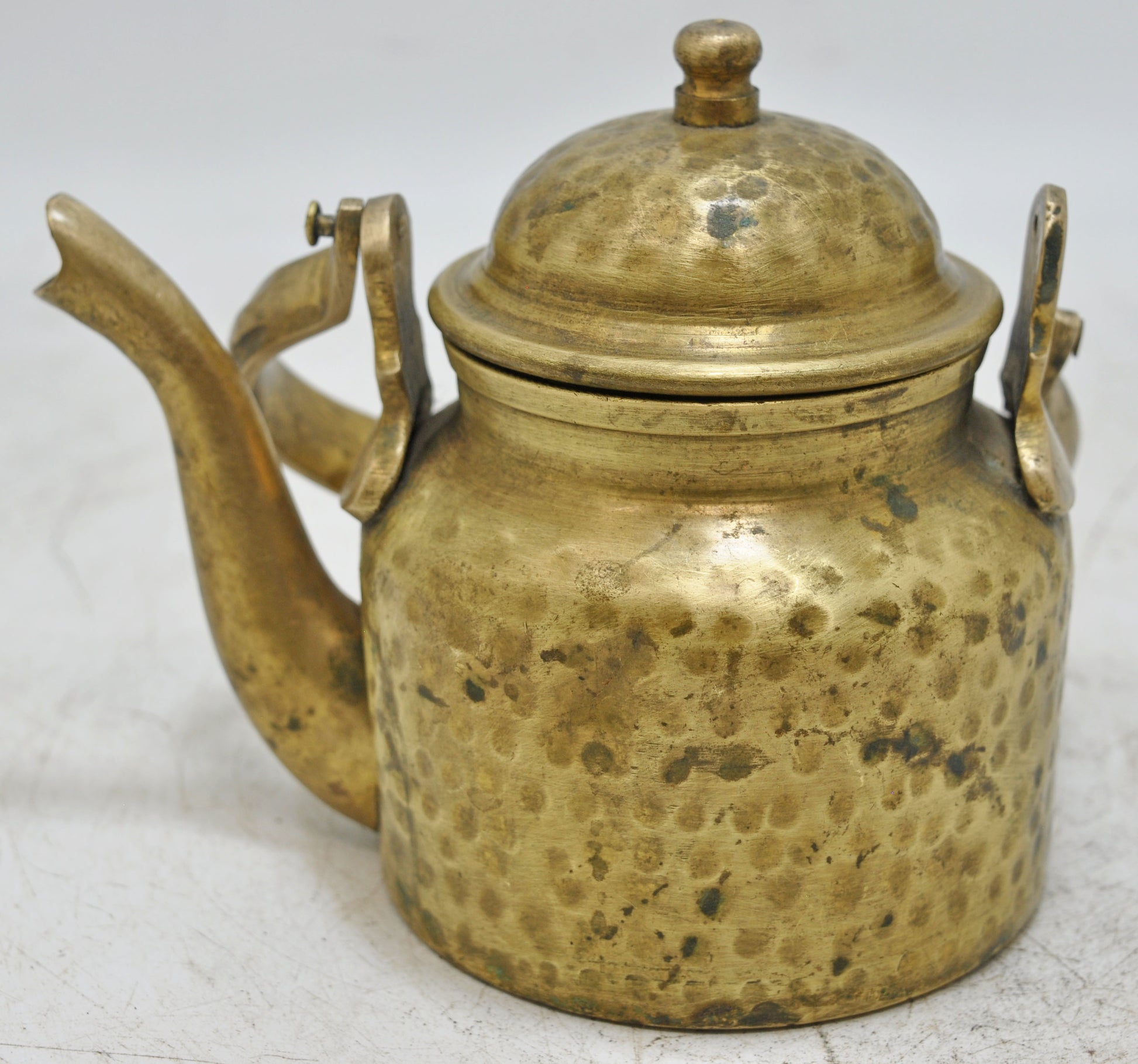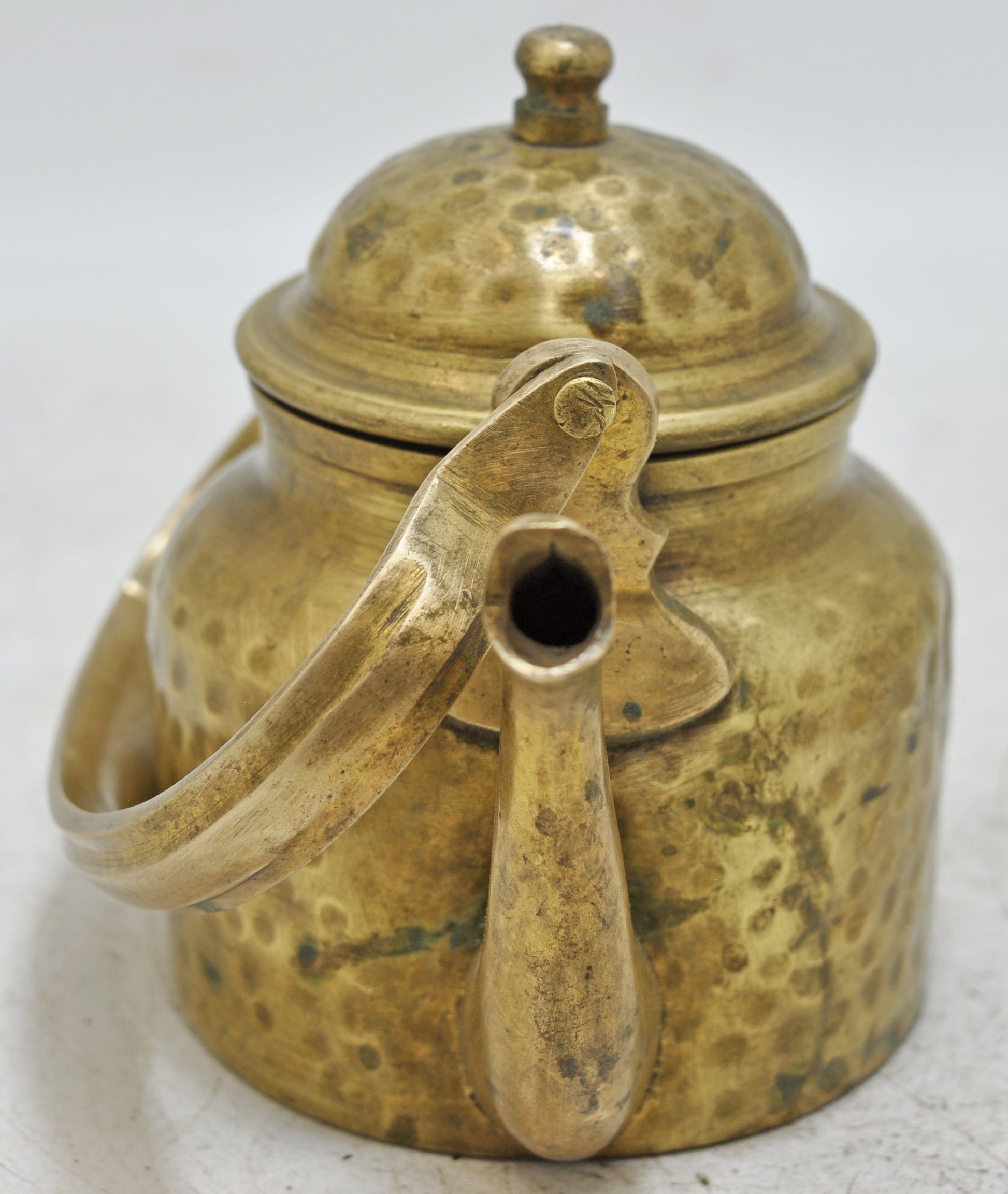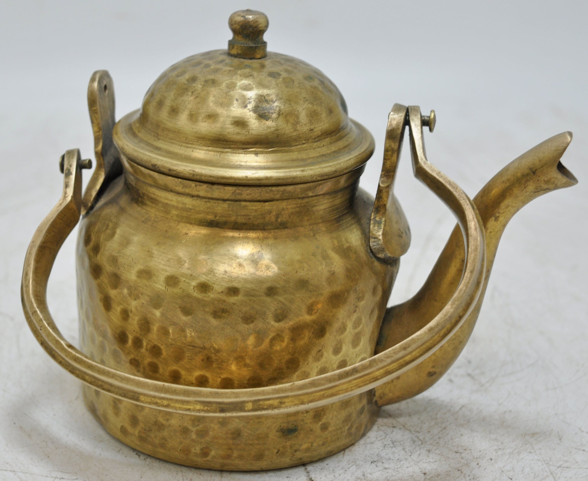 A charming and well-preserved old brass small kettle from India, historically used for elegant tea service. This piece features lovely hand-craftsmanship, an appealing shape, distinctive hammering details, and a sturdy handle. In good overall condition, it displays a captivating, rich patina, reflecting its age and heritage.