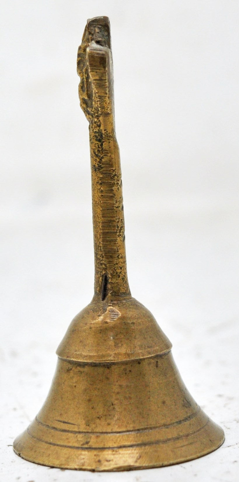 A nice looking old brass bell originally used during aarti ceremonies in temples. Hand crafted in a nice shape and engraved. Good condition and a rich patina. Origin India.