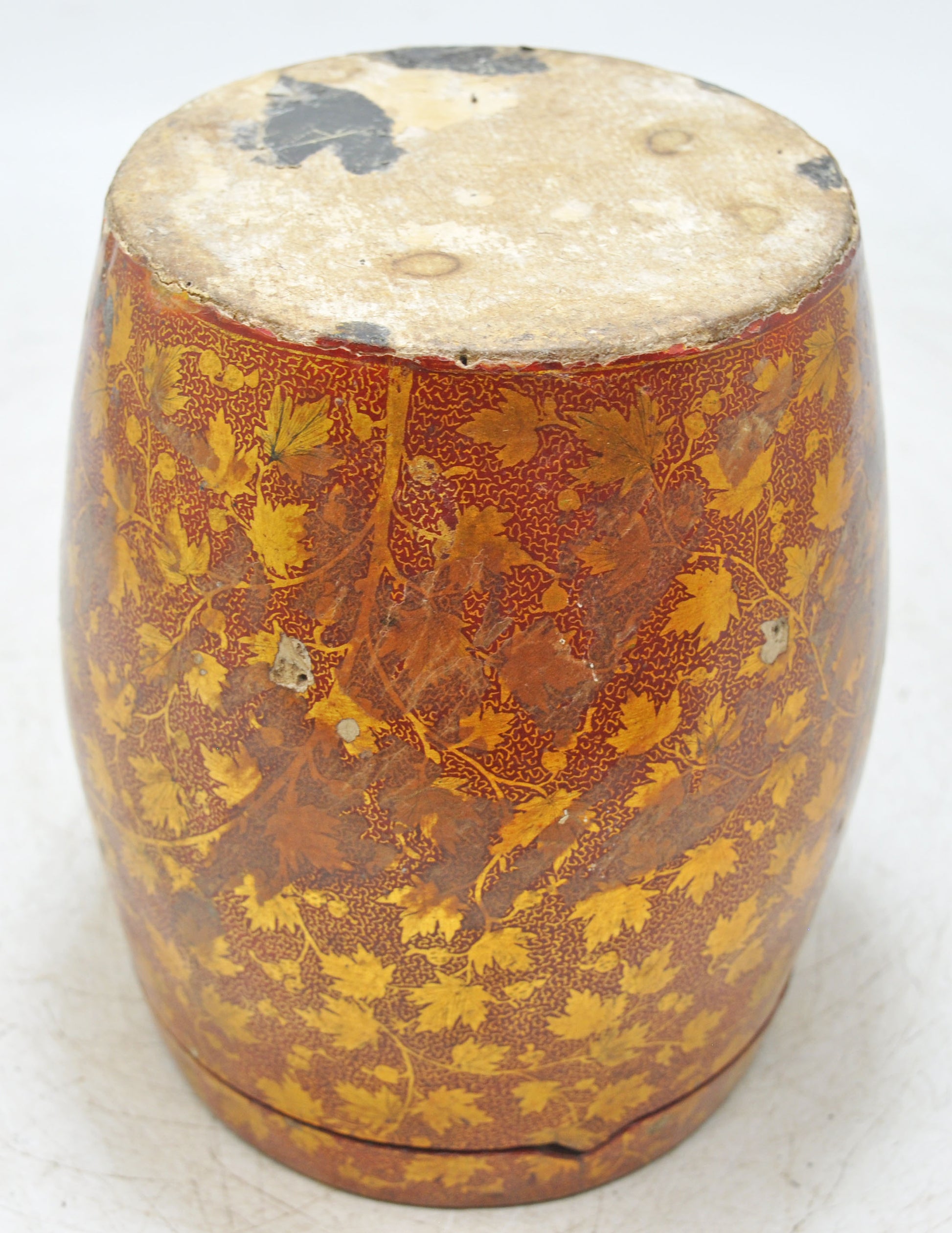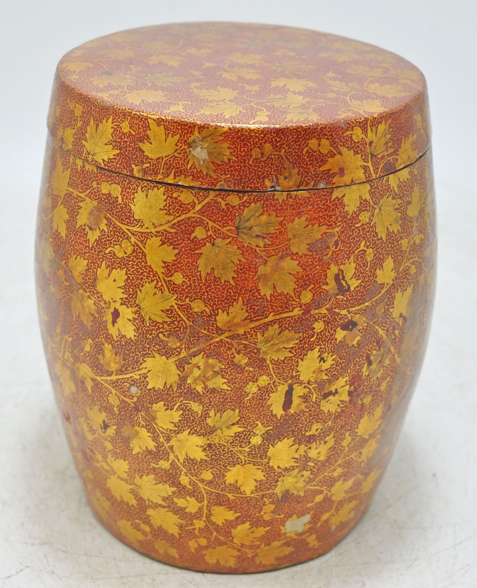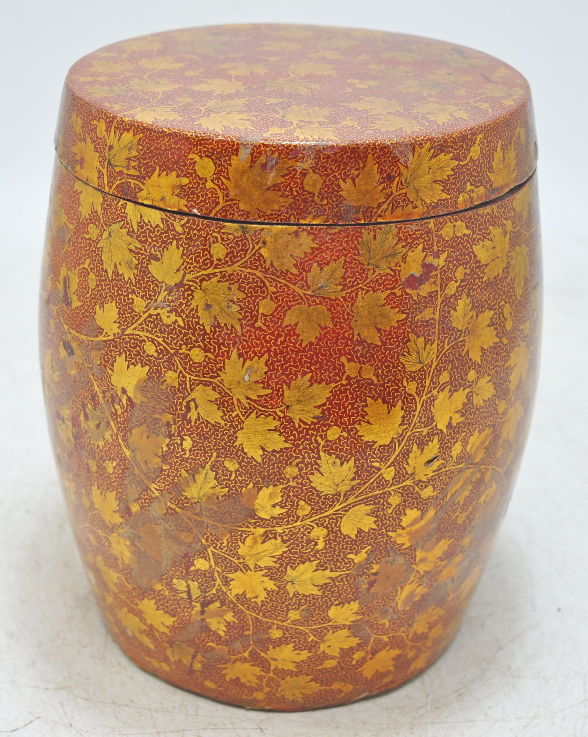 An impressively large vintage candy box crafted from solid wood and carved by hand with refined care. Its lacquered surface gleams softly, featuring layers of glossy pigments that enhance the bold shape. The aging process has given the wood a deep patina, adding character and warmth. This piece once held sweets for festive occasions, making it a delightful reminder of old household traditions. Well-preserved and visually striking. Origin India.