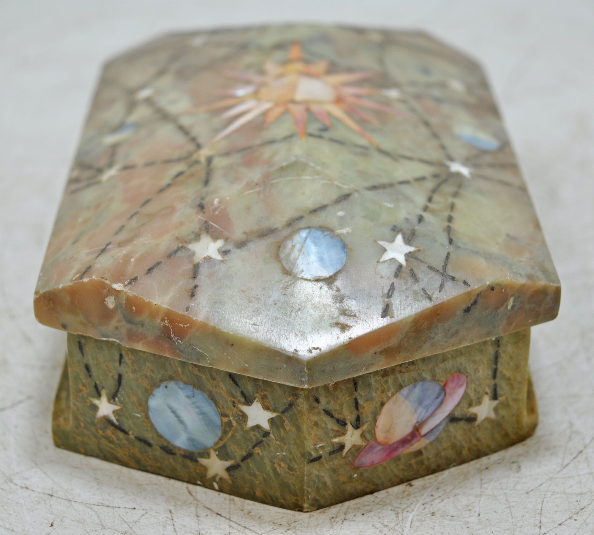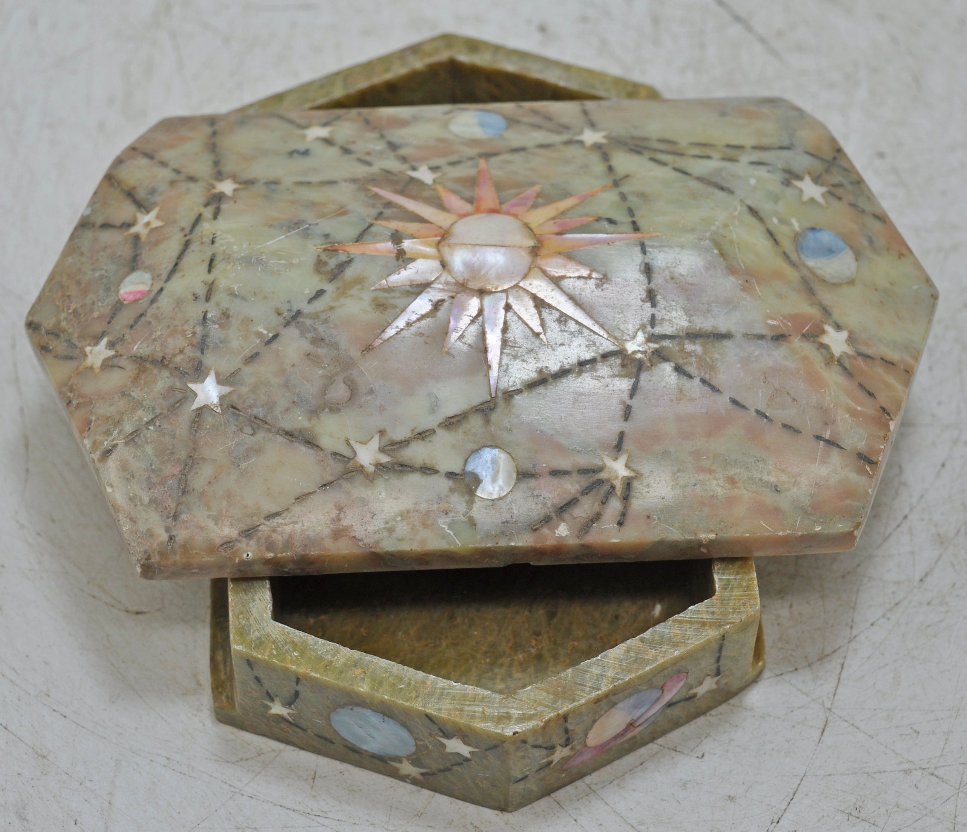 A striking hexagonal jewelry box carved from elegant green marble, shaped entirely by hand by skilled artisans. The surface features delicate inlay work depicting suns and stars, each piece fitted with precision, giving the box a celestial charm. The marble has developed a soft, aged patina that enhances its natural depth and smooth texture. Beautiful as a decorative accent or storage piece. Good condition. Origin India.