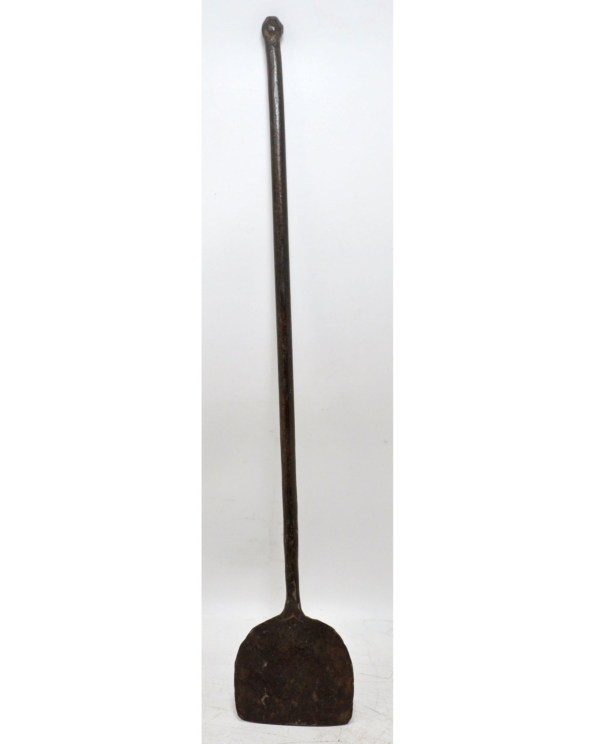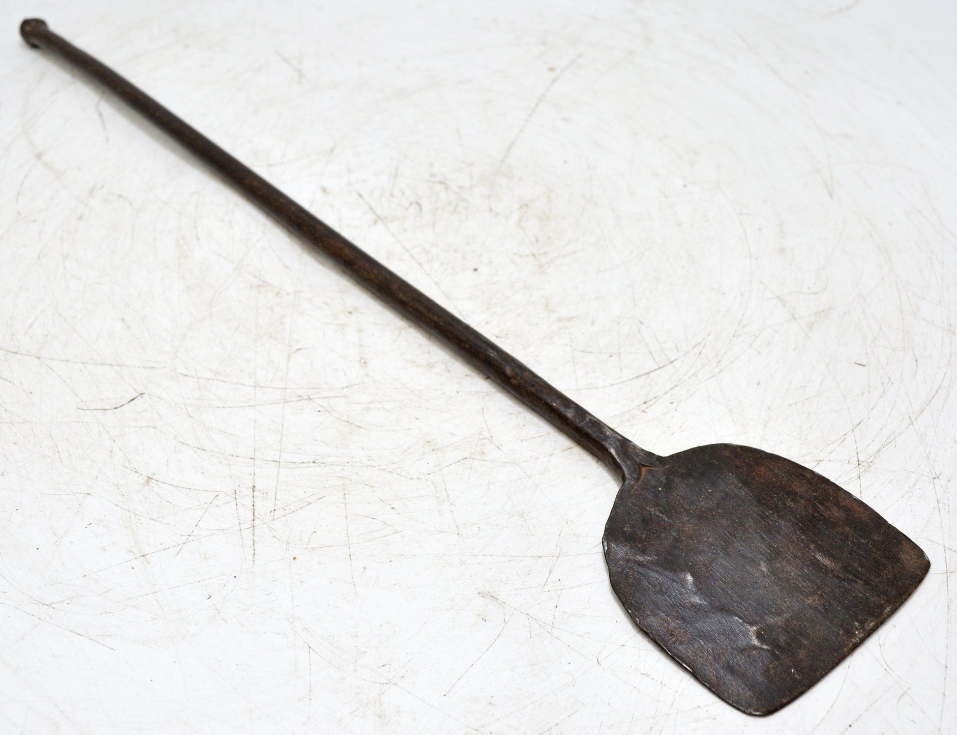 This antique iron long kitchenware cooking masher is an original, hand-crafted piece with a beautiful design. The item has been well maintained and features a rich patina. It originated from India and is in excellent condition.