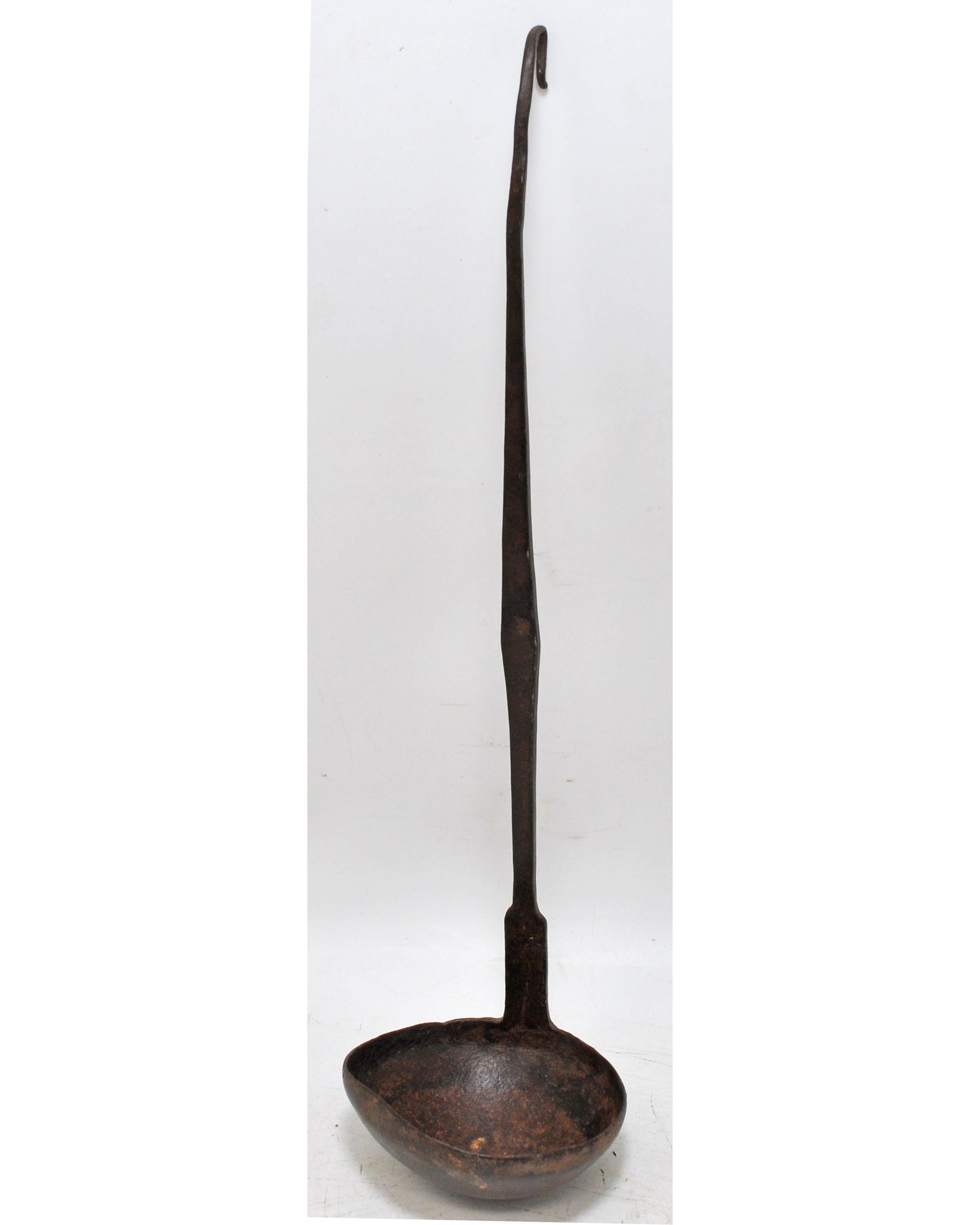 This antique iron long spoon, known as a Tipri, was traditionally used for dispensing ghee oil. It boasts a beautifully crafted design and intricate engravings. With its well-maintained condition and stunning patina, this piece originates from India.