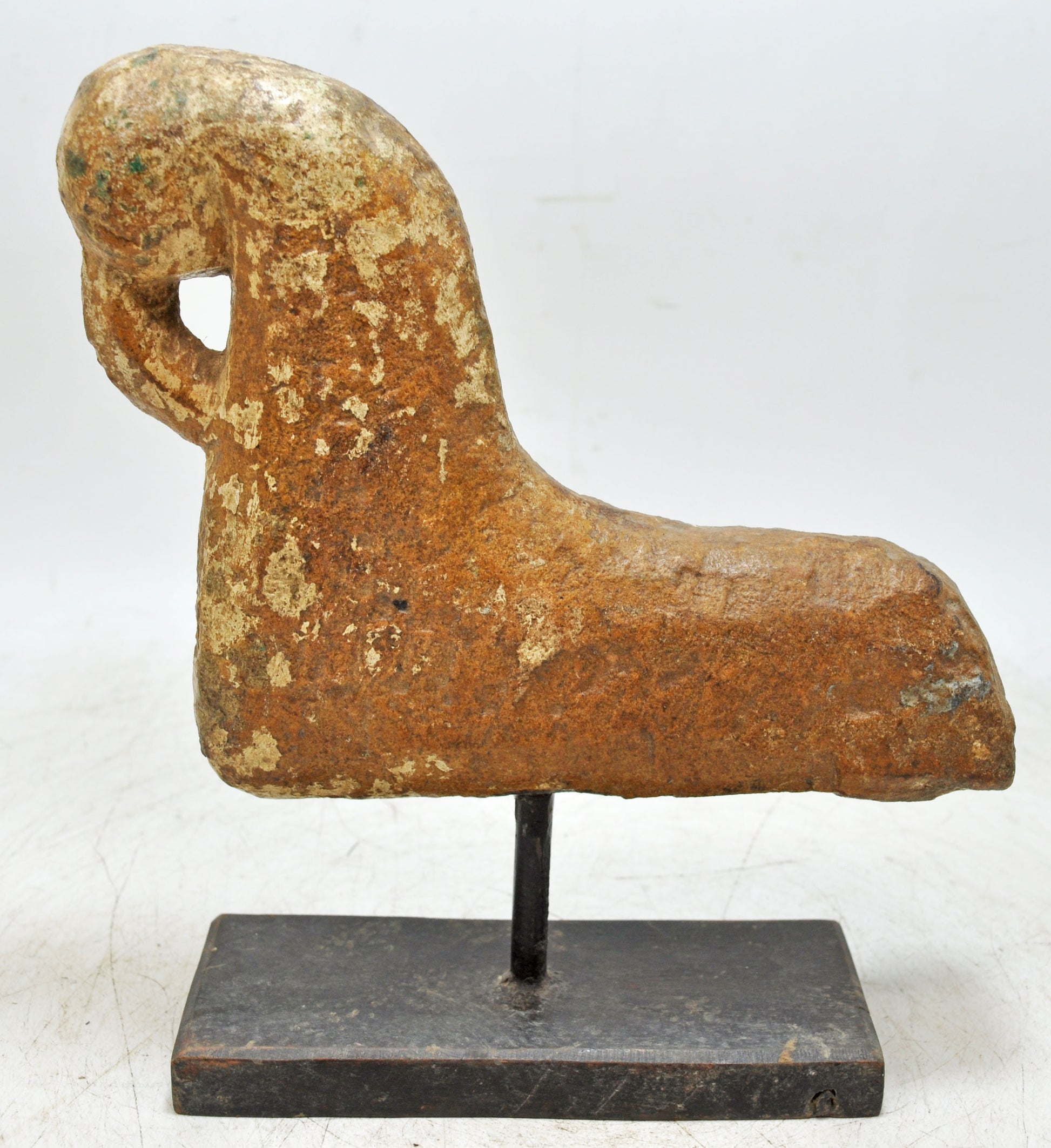 An old sandstone bird figurine, shaped by hand with smooth contours and a pleasing natural form. The carver worked the stone with care, allowing the simplicity of the bird’s shape to stand out. The surface displays an aged patina, adding softness and character that only time can create. In good condition, this sculpture reflects traditional craftsmanship and rustic charm. A wonderful collectible piece originating from India.