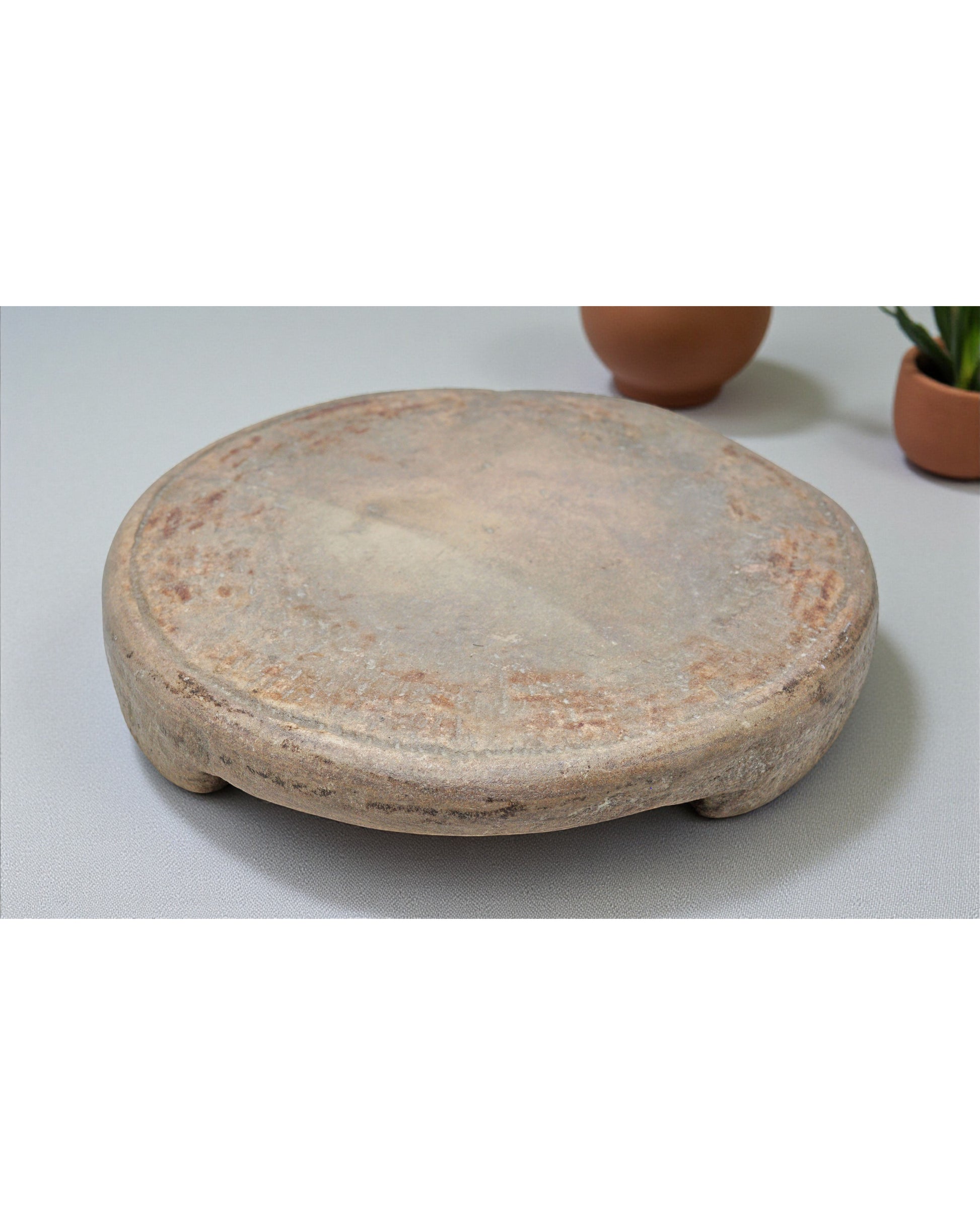 Here is an original sandstone rolling plate from India, once part of daily life in village kitchens where chapati dough was shaped with care. It has been carefully hewn by hand, resulting in beautiful organic contours and a tactile finish. The rich patina reflects decades of usefulness, making it both visually appealing and historically meaningful. Whether used as a décor base, a centerpiece, or a collectible artifact, it carries the presence of tradition, craftsmanship, and timeless simplicity. Good condition. Origin India.