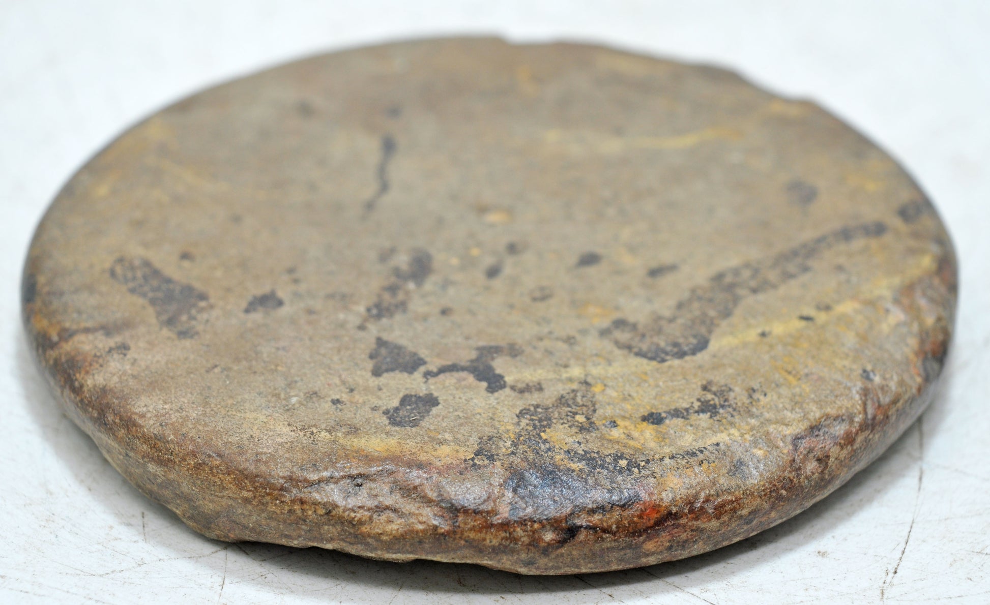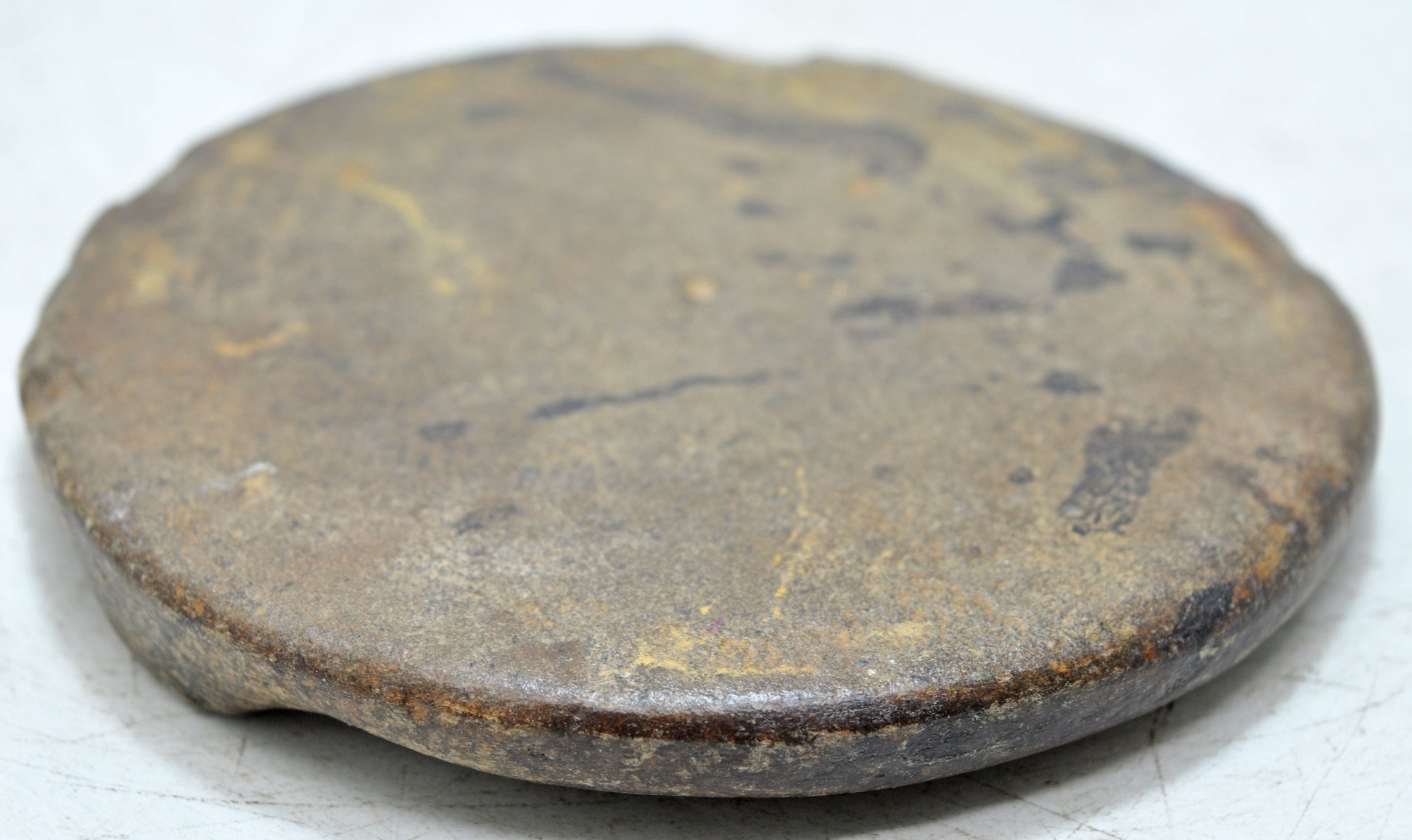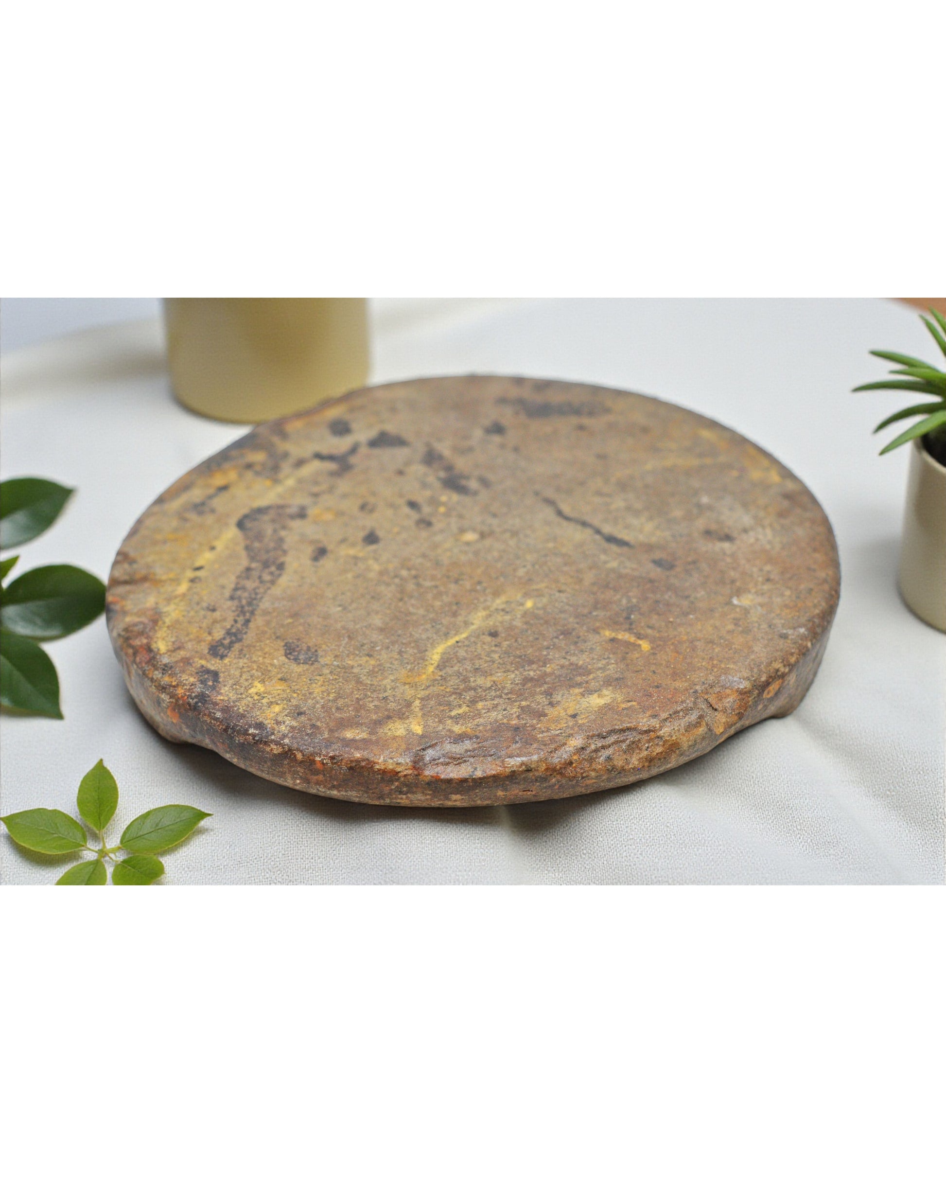 An old handcrafted saffron grinding plate made from dense sandstone, featuring a smooth, rounded profile. Its tactile surface bears evidence of traditional use in preparing tika paste for religious or festive rituals. The naturally formed patina enhances the color and texture of the stone, giving it an appealing, timeworn appearance. Ideal for collectors or designers seeking heritage objects with authenticity and soul. Good condition. Origin India.