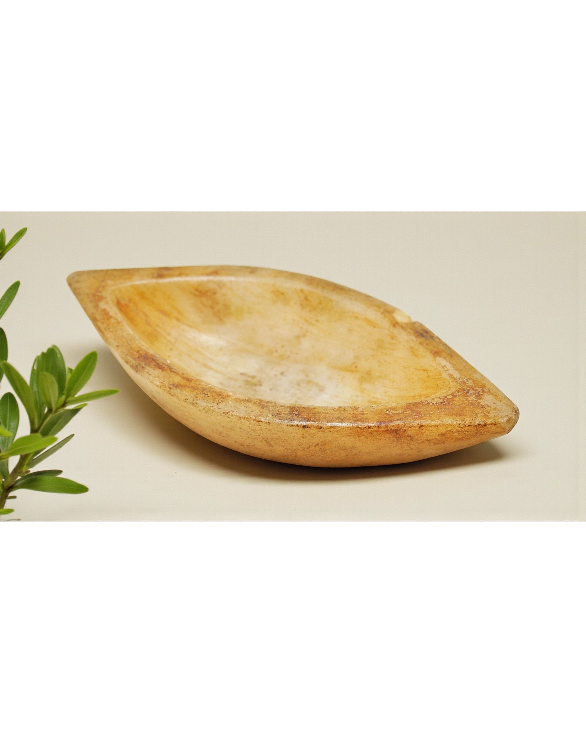 A striking old kharal bowl carved from a block of white marble, featuring an elongated oval silhouette that reflects patient handwork. The smooth interior once held spices being ground for daily cooking, and the exterior now displays a soft patina formed naturally through decades of use. Its form is both utilitarian and sculptural, making it an ideal decorative collectible for those who appreciate heritage kitchenware. In good condition and rich with history. Origin India.