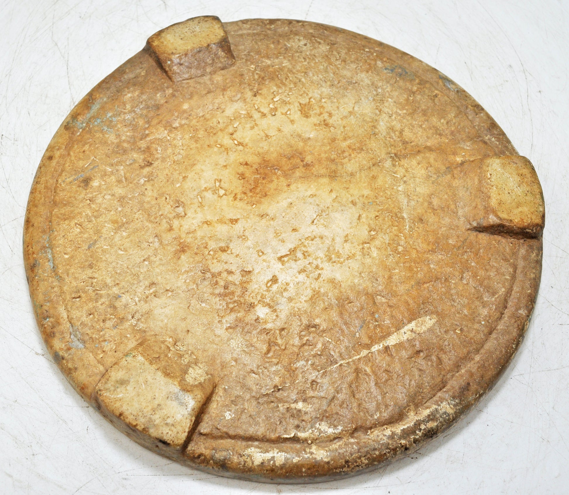 This old round plate, crafted from fine white marble, was traditionally used as a rolling board for chapati bread in Indian homes. Its form is intentionally hand carved, creating a graceful shape that feels both artistic and functional. The naturally aged surface, softened from years of use, gives it an appealing patina. With its serene presence and historical background, it makes a standout décor element—perfect for display on shelves, kitchen counters, or tabletops. Good condition. Origin India.