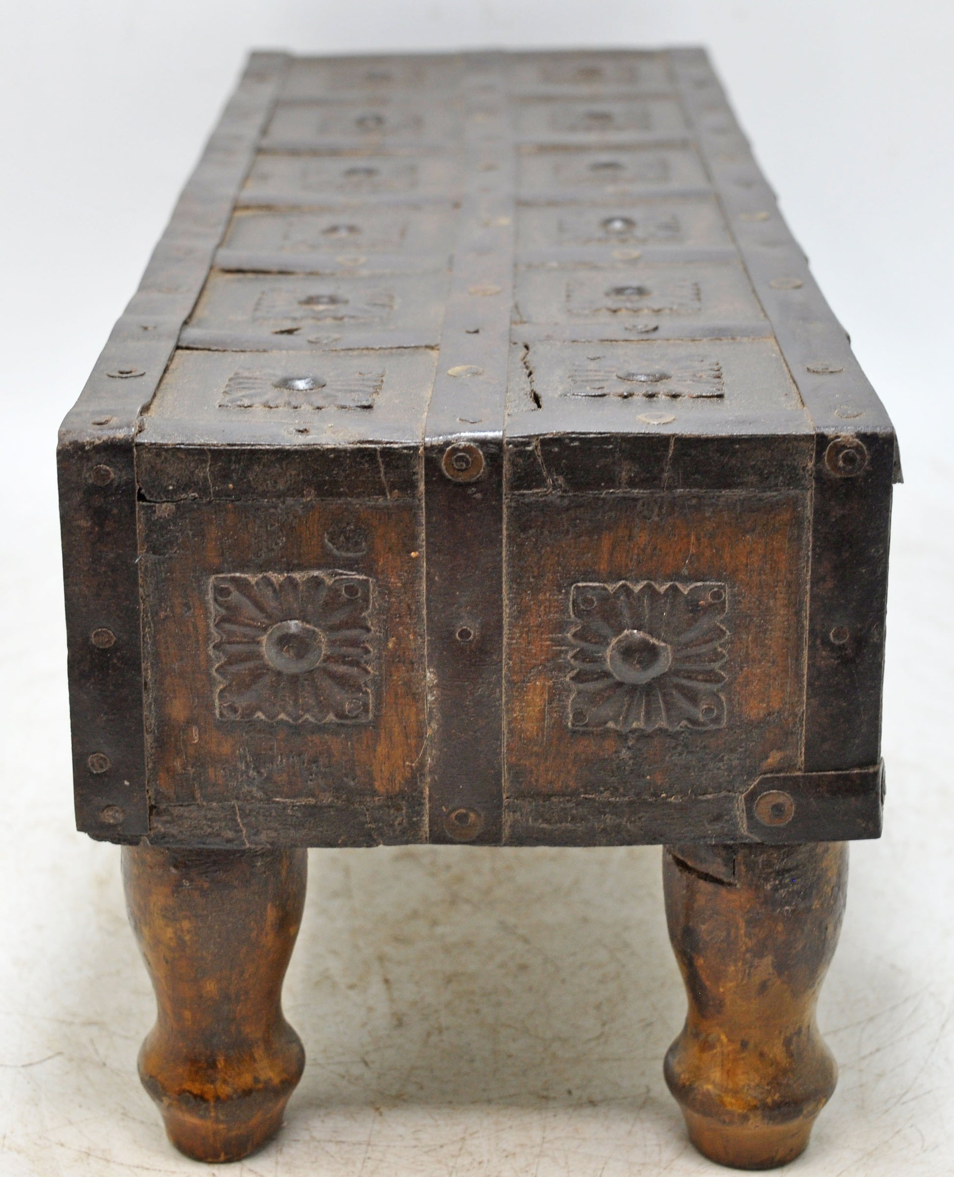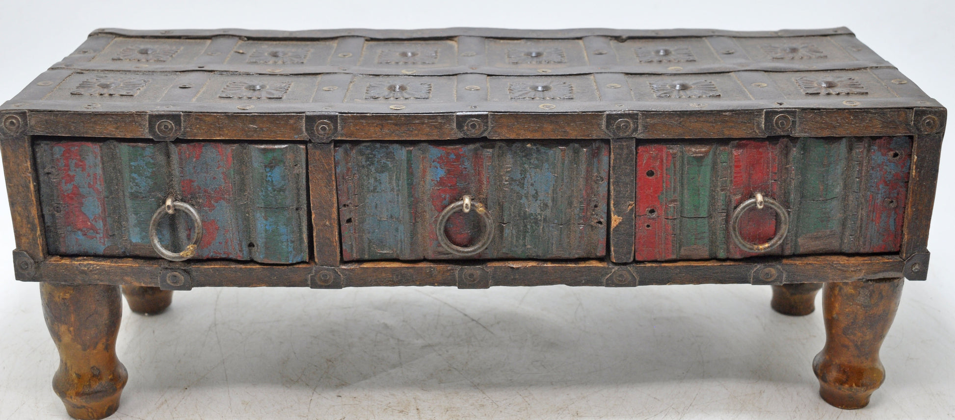 This vintage wooden storage chest with three drawers reflects traditional artistry and durability. Carefully shaped by hand, it retains its original rustic coloring, which enhances its authentic character. The surface shows a naturally aged patina, giving the piece warmth and depth. Well-preserved and sturdy, it serves both functional and decorative purposes. A collectible antique with origins in India, perfect for adding heritage charm.
