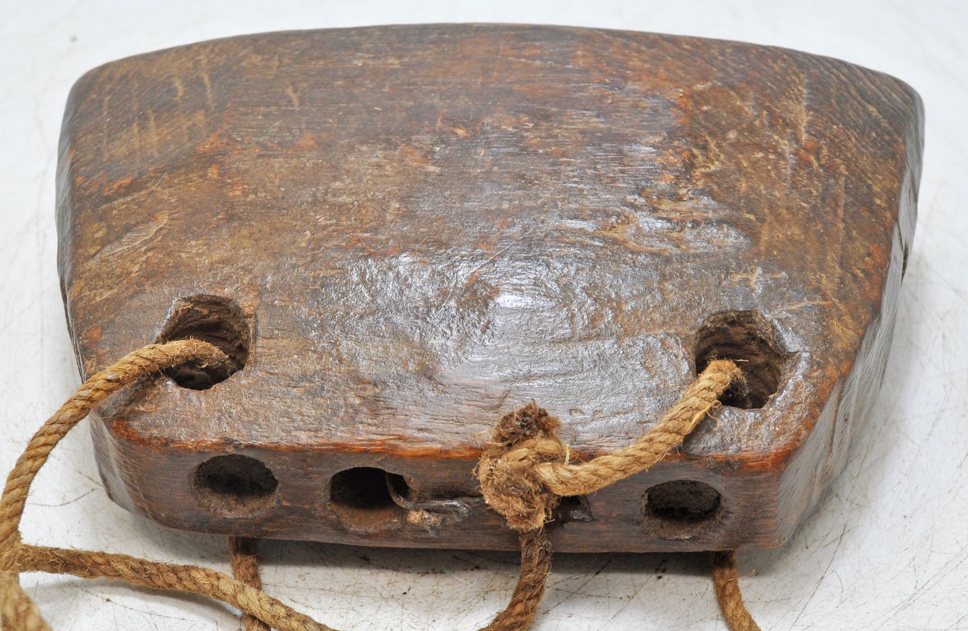An old wooden animal bell, elegantly hand carved with attention to detail and balanced form. The piece retains a warm, time-worn patina and remains well preserved, showcasing the craftsmanship of Indian artisans. Ideal for display or as a collector’s item, it embodies both functional charm and cultural heritage, offering timeless appeal for enthusiasts of traditional artifacts.