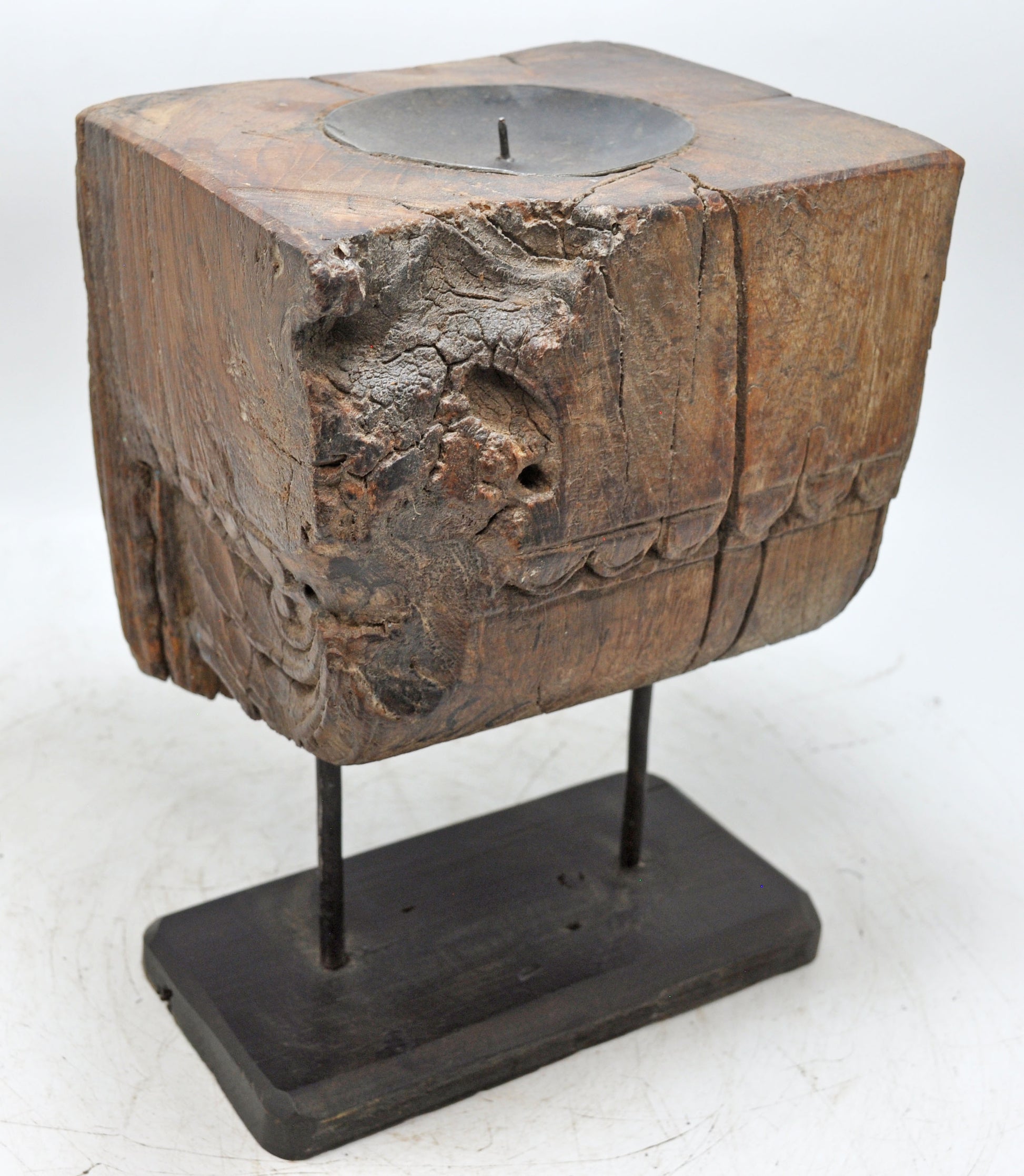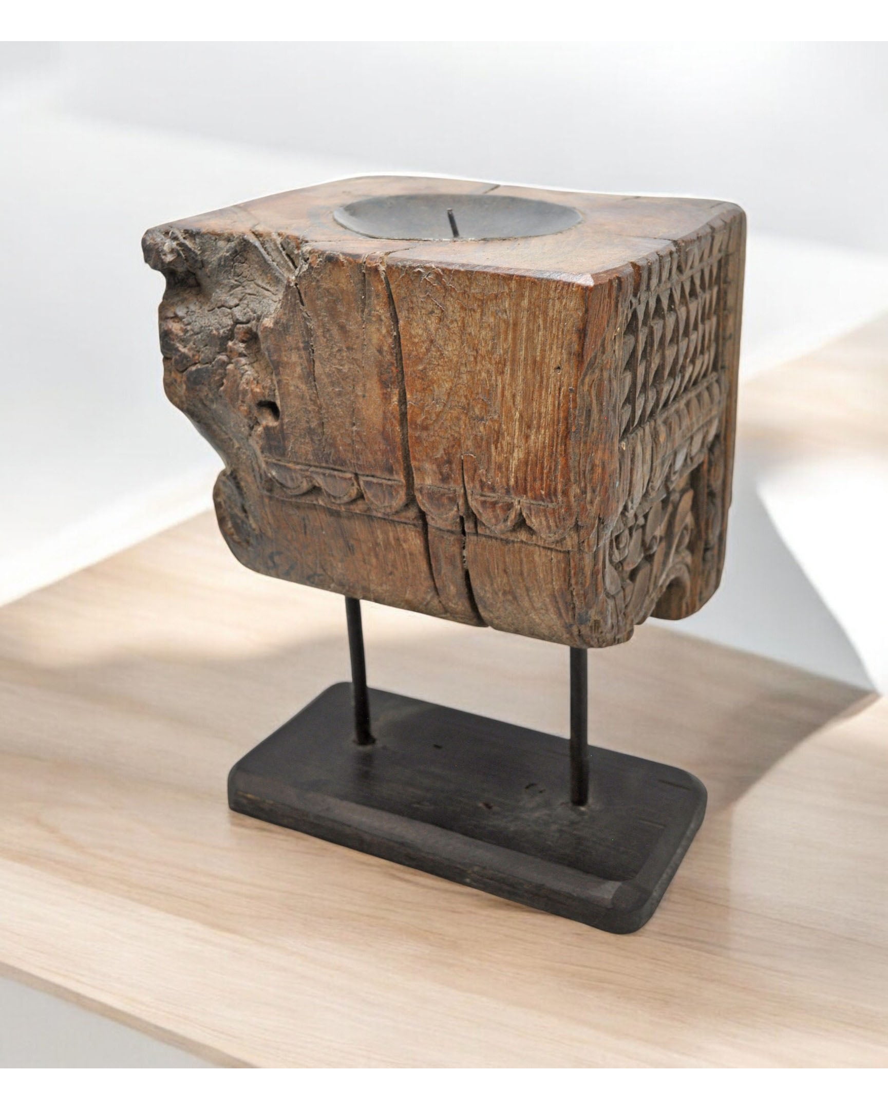 Crafted from original antique columns, this hand-carved wooden bracket doubles as a candle holder. With intricate detailing and a rich patina, this piece is a testament to the skilled craftsmanship of India. In good condition, it adds a touch of elegance to any space.