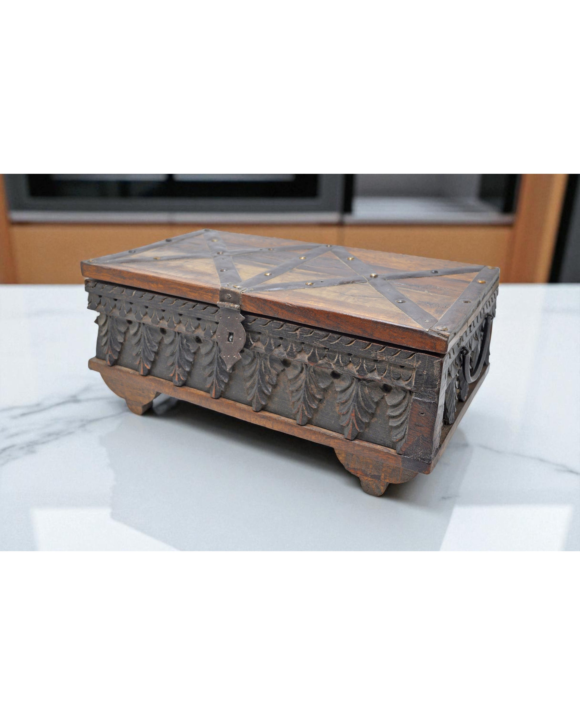 A magnificent, hand-carved treasure chest from India. This large wooden storage box features intricate panels on three sides and has a rich, lustrous patina, a testament to its age and journey. It's in excellent condition and ready to be a stunning centerpiece in any room.