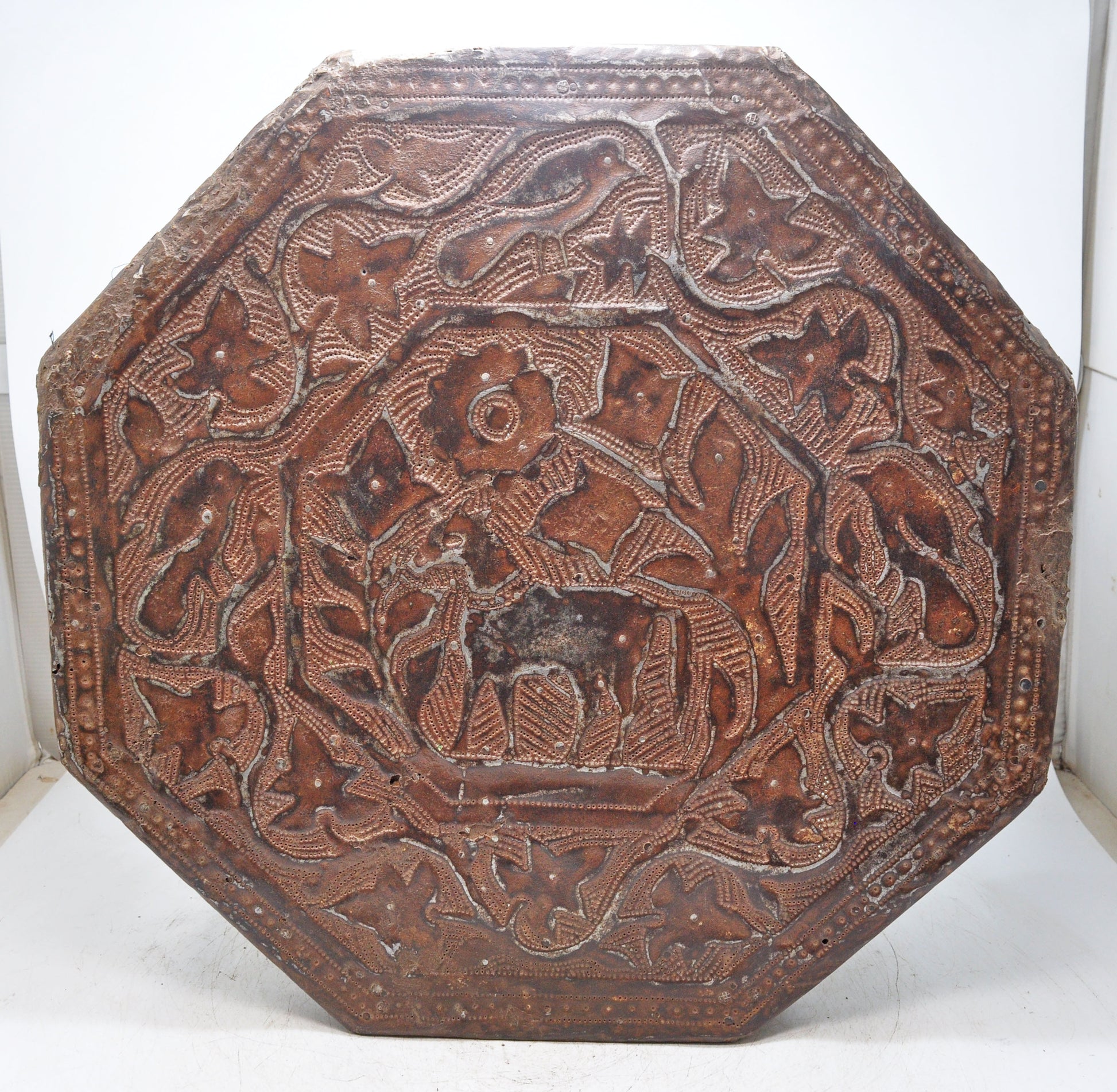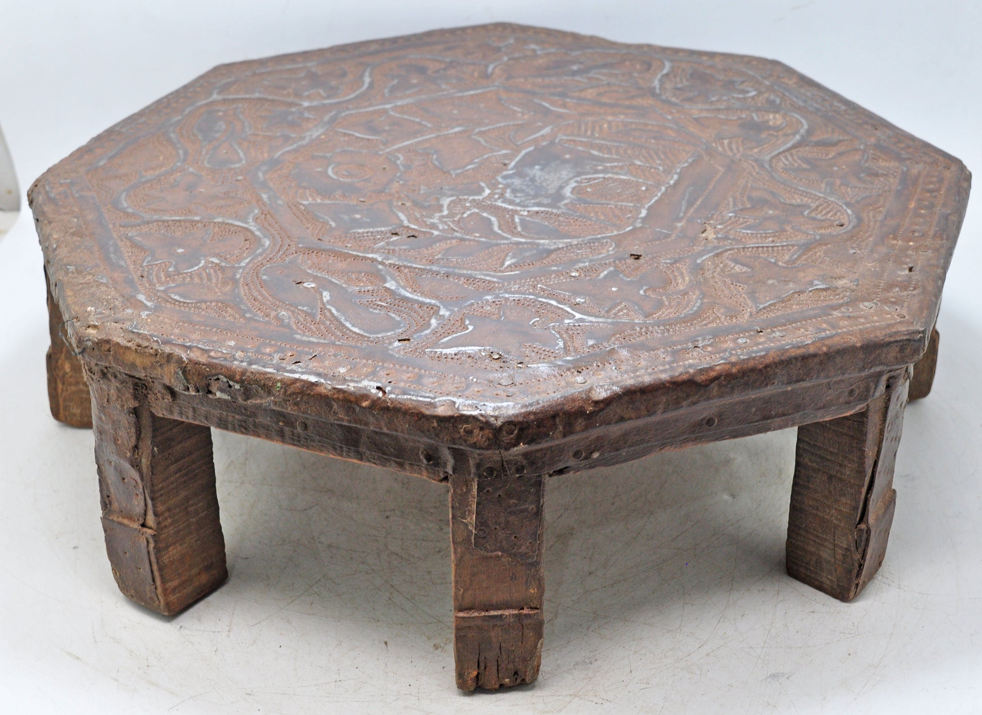 A unique decorative piece, this Hand-Crafted Octagonal Bajot Table is a beautiful old wooden low stool originating from India. This Bajot was primarily utilized as a personal dining surface for floor seating. It features a substantial octagonal form that was skillfully hand-wrought and is further enhanced by attractive intricate embossed metal work across the surface. The table possesses excellent maintenance and a noticeable deepened surface tone, which beautifully highlights the wood grain and its veteran status.