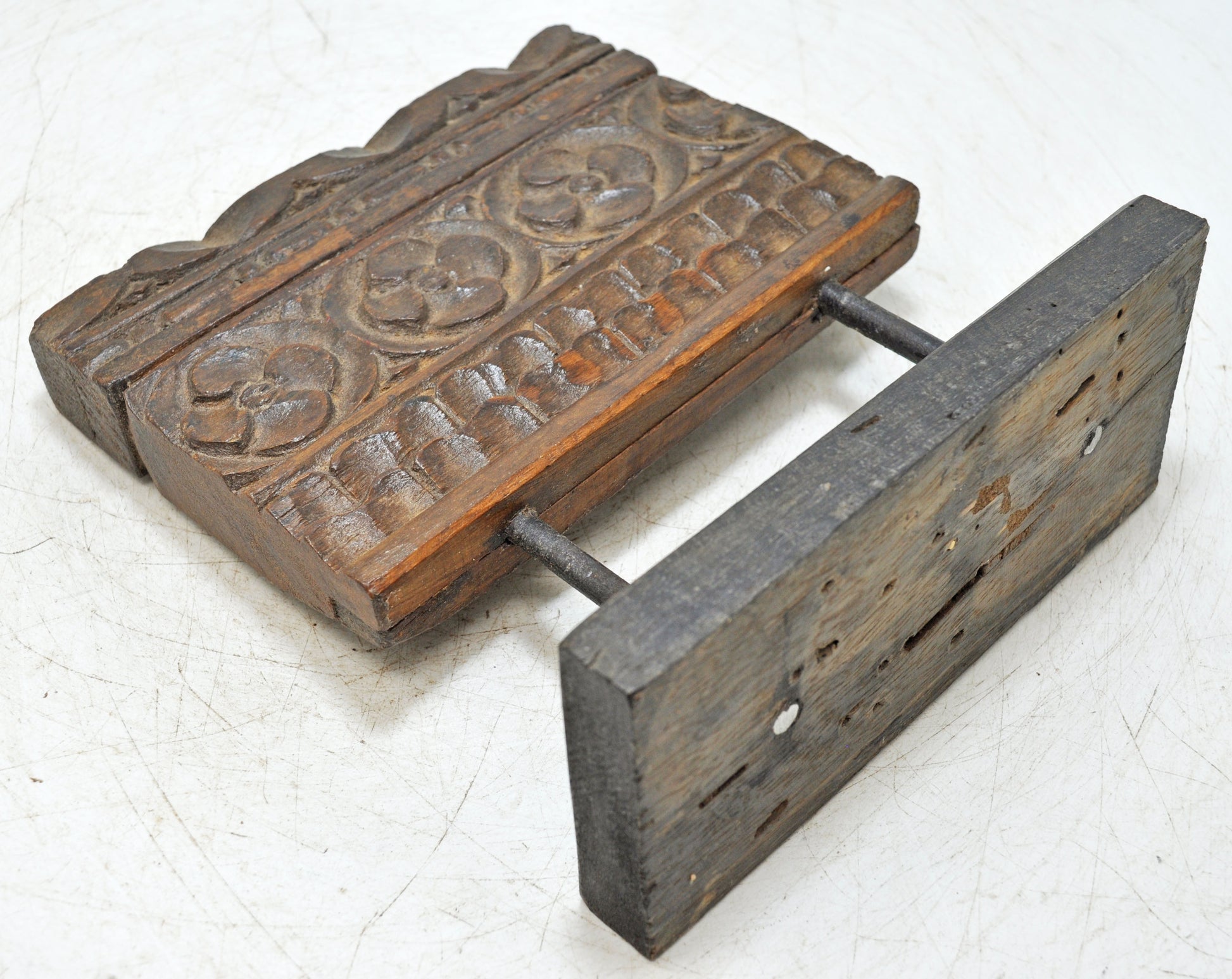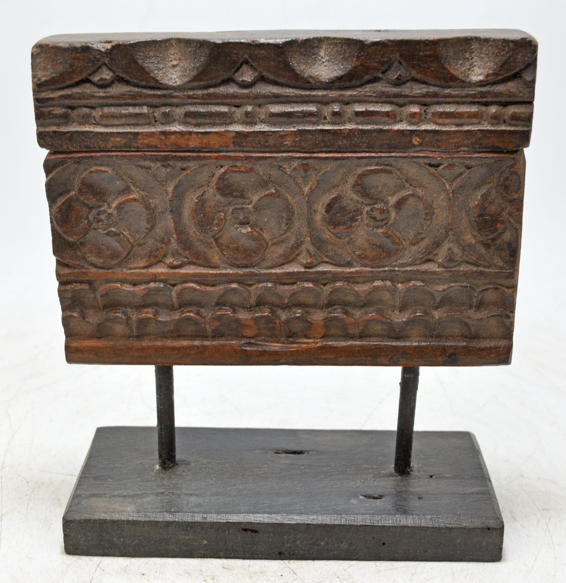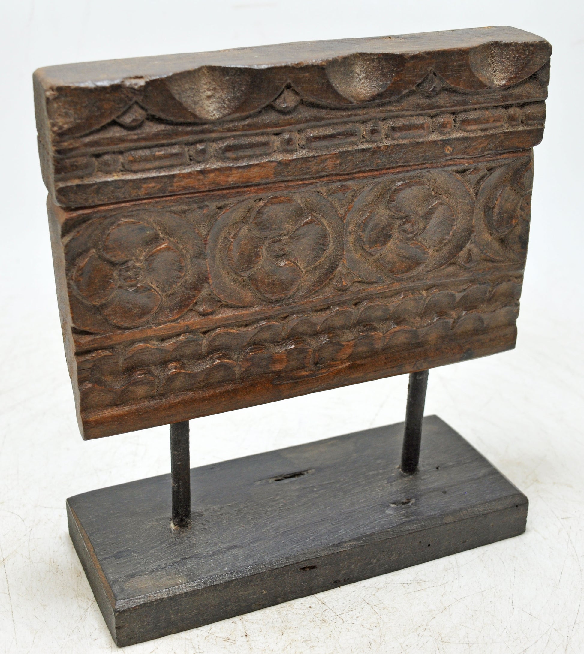 An antique-style wooden floral panel, showcasing intricate hand-carved artistry inspired by traditional Indian motifs. Each design element is rendered with graceful curves and fine depth, displaying the mastery of early woodworkers. Mounted on its sturdy wooden base, it offers both artistic and decorative value. The original aged polish and deep patina tell the story of time, craftsmanship, and preserved cultural heritage.