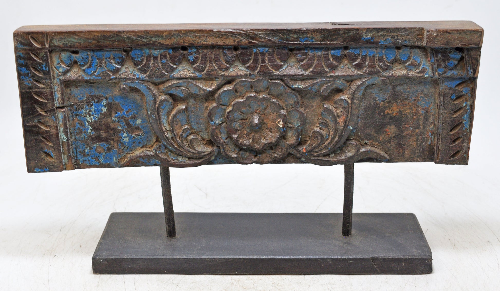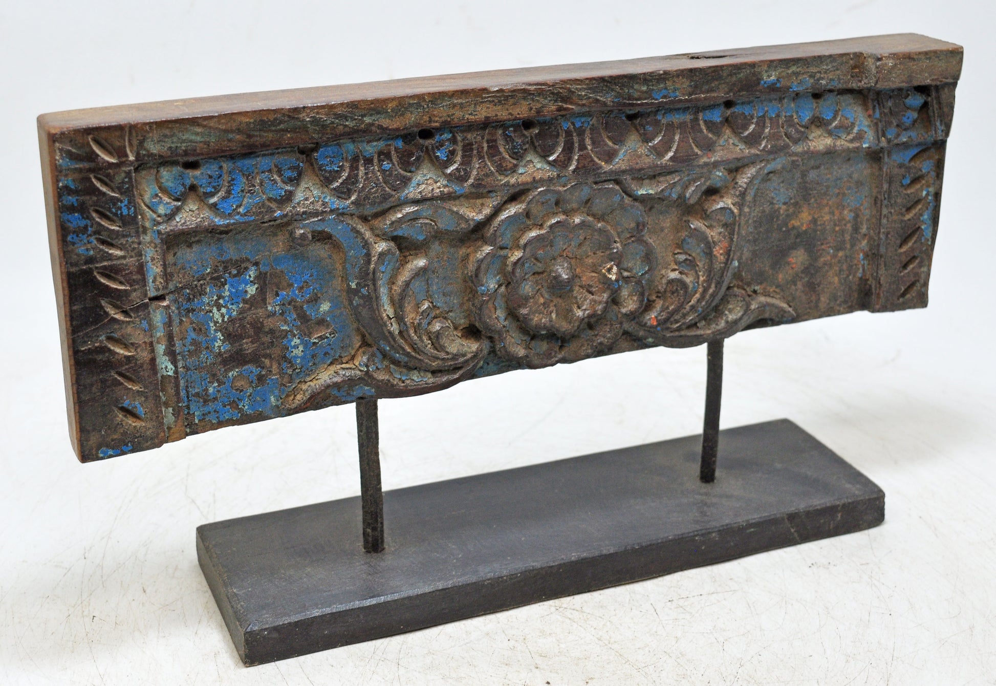 Here is a rare Historic Hand-Embellished Floral Panel, an impressive old wooden plaque that brings a sense of traditional opulence. The timber surface has been entirely hand-sculpted with elaborate ornamental patterns, showcasing truly intricate workmanship. To facilitate viewing, the plaque is firmly situated upon a detachable stand. It maintains a wonderful state and carries a desirable darkened finish that emphasizes the texture and age of this beautiful carving, which originated in the subcontinent of India.