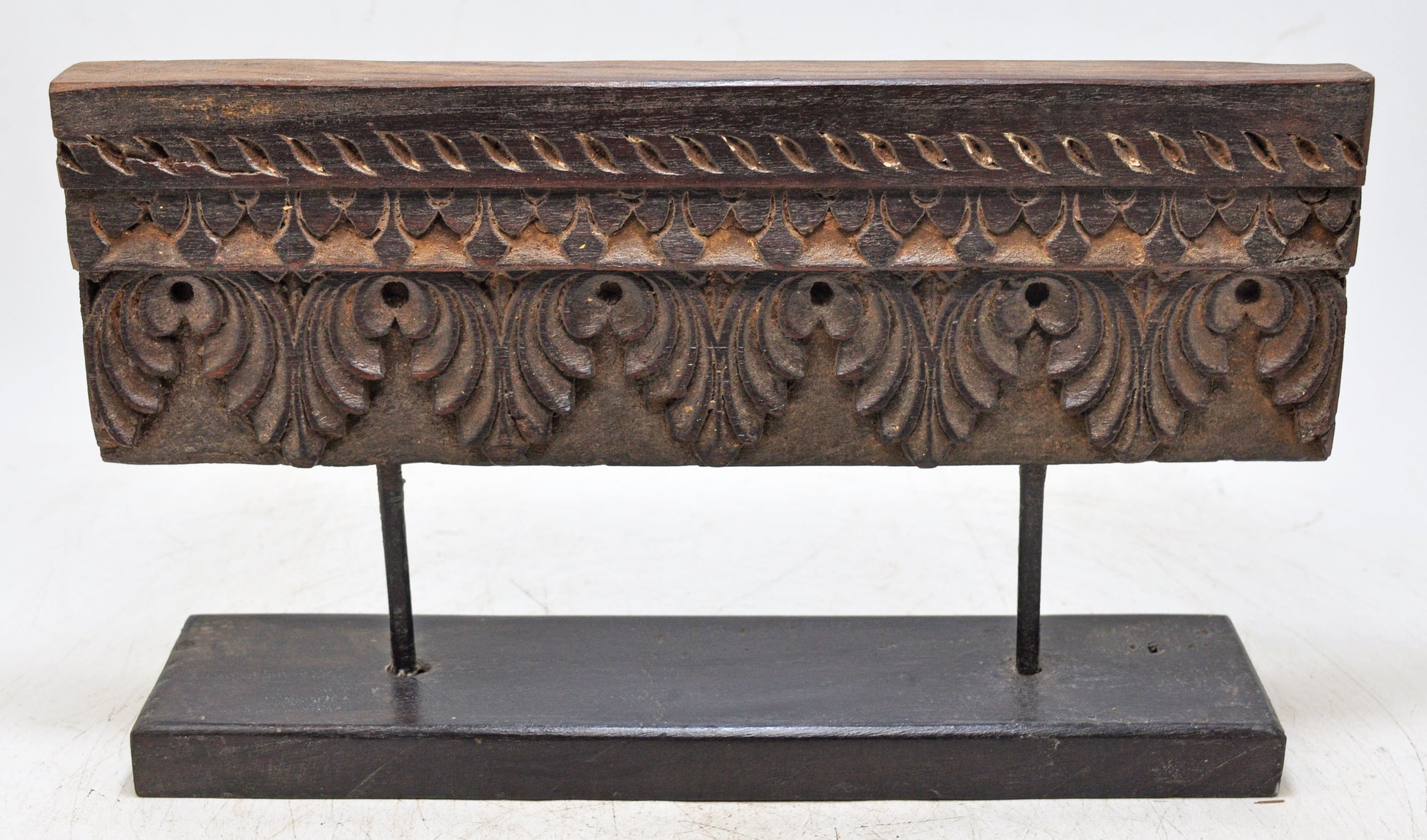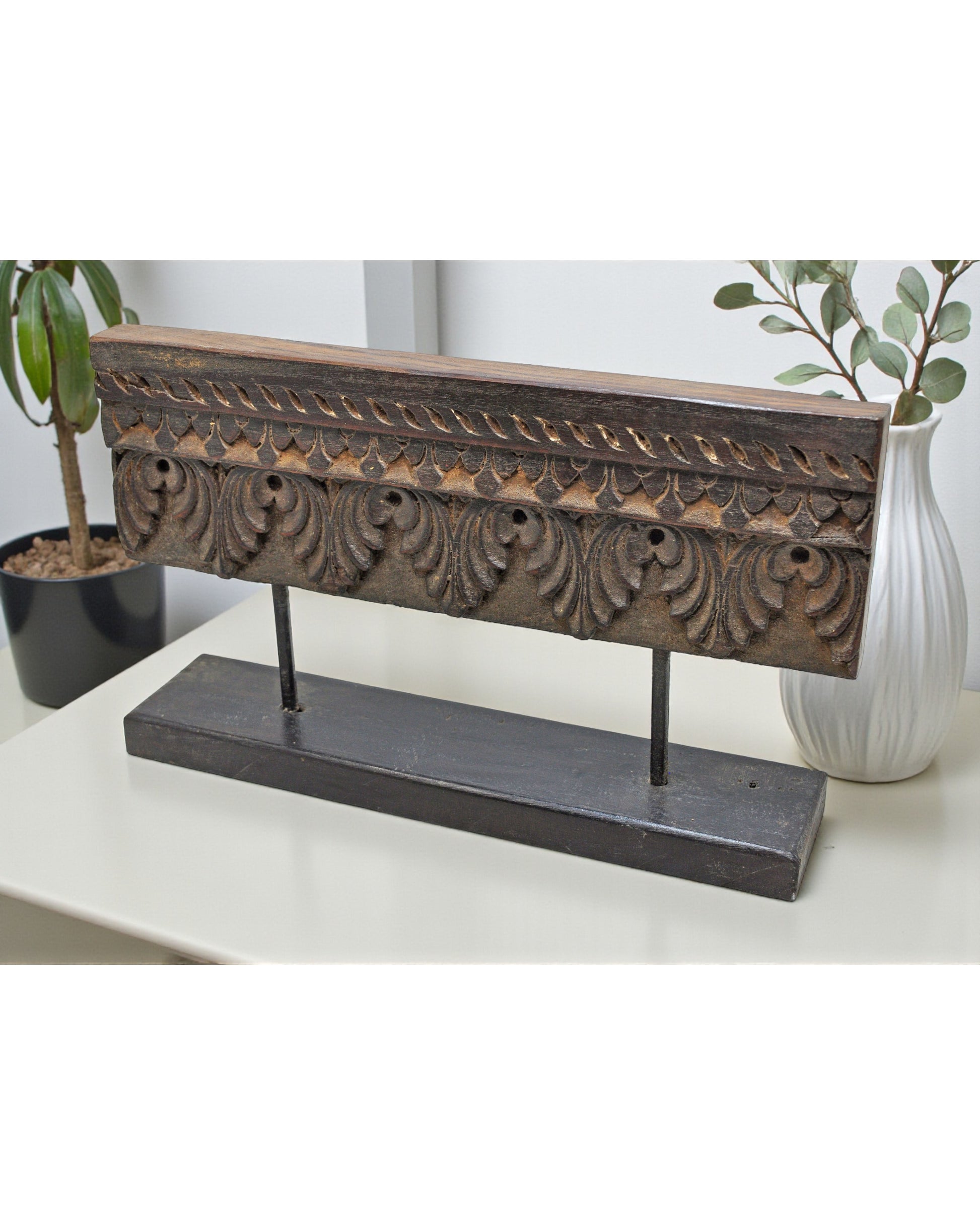This gorgeous Distinctive Antique Wooden Relief Panel is a substantial old wooden floral plaque that exemplifies fine decorative skill. The surface features an exquisite hand-sculpting technique, rendering the natural patterns with striking precision. It is thoughtfully placed upon a robust support structure, ensuring the plaque is ready for immediate showcasing. It exhibits remarkable durability and possesses a superb darkened warmth, which lends historical significance and prestige to this artistic creation from India.