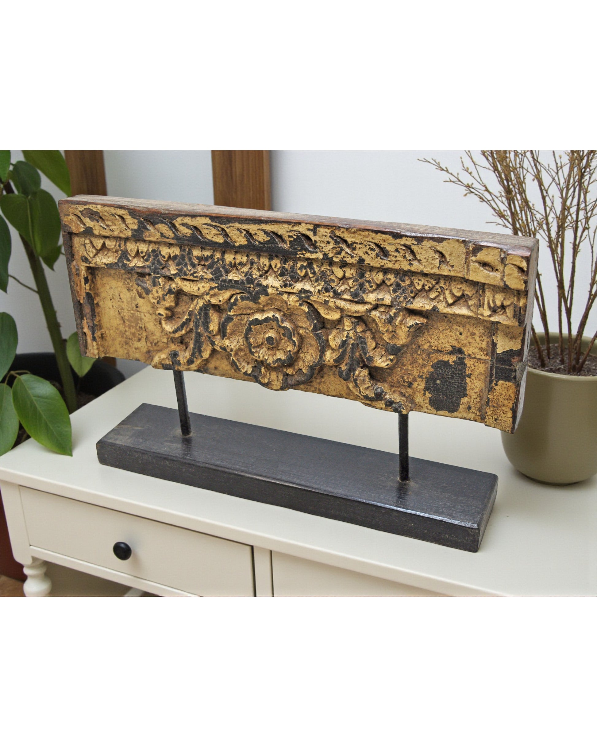 Offering an elegant touch, this Splendid Vintage Wooden Carving Accessory is a beautiful old wooden floral plaque originally fashioned in India. The panel has been skillfully hand-engraved, showcasing elaborate plant life and marvelous figurative details. It includes a sturdy, incorporated base for stable arrangement on any surface. The plaque retains its original integrity and displays a wonderful sienna tone throughout the wood, ensuring it stands as a unique and memorable statement accent.