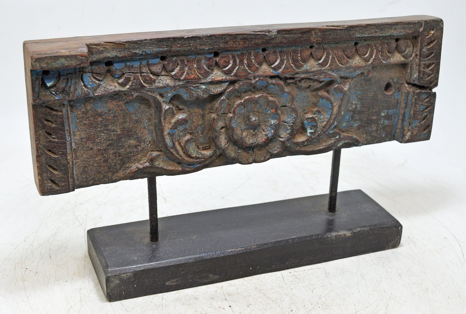 Behold this exceptional Ornamental Wooden Carving Masterpiece, a splendid old wooden floral plaque originating from the skilled hands of Indian craftspersons. The wood showcases an elaborate display that has been intricately hand-impressed, capturing striking minute features. This substantial plaque rests upon an included base support, assuring stable exhibition. The condition is notably unblemished, displaying an attractive darkened pigment that highlights the texture and elevates the aesthetic worth of this gorgeous timber artifact.