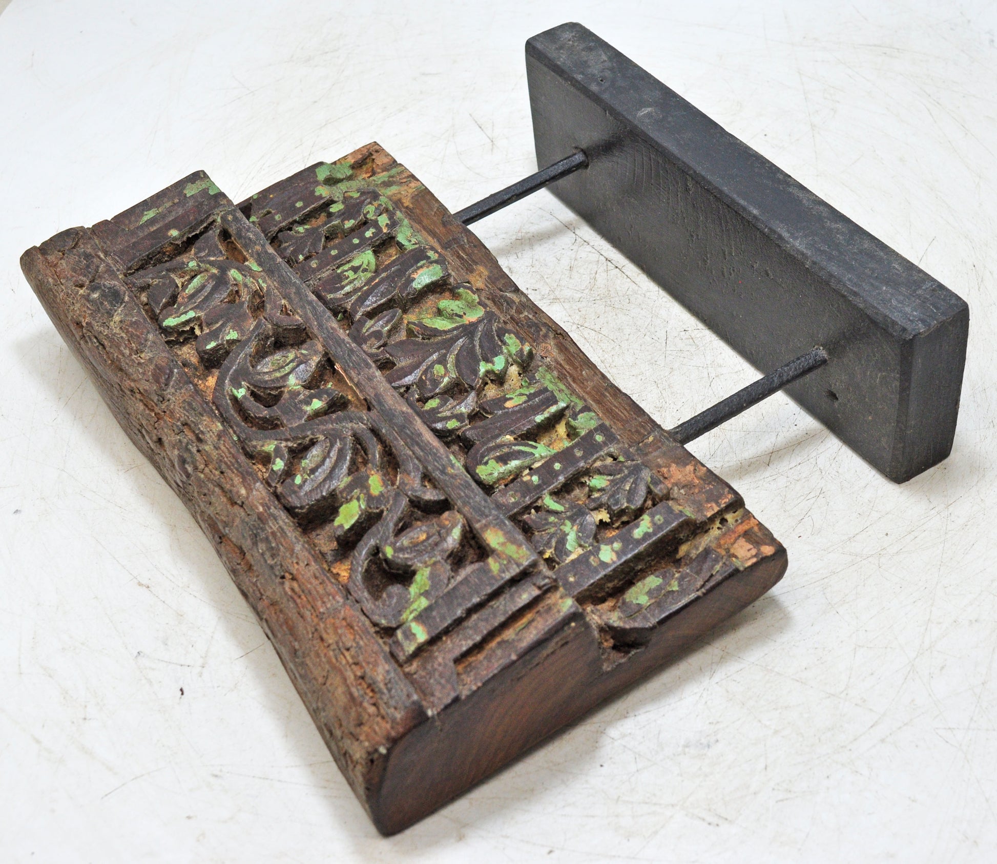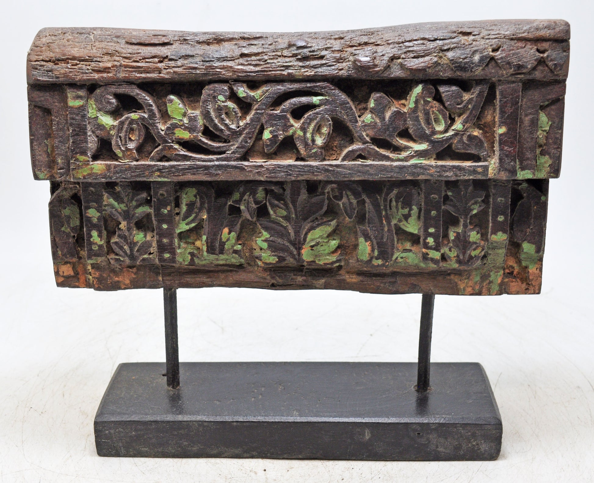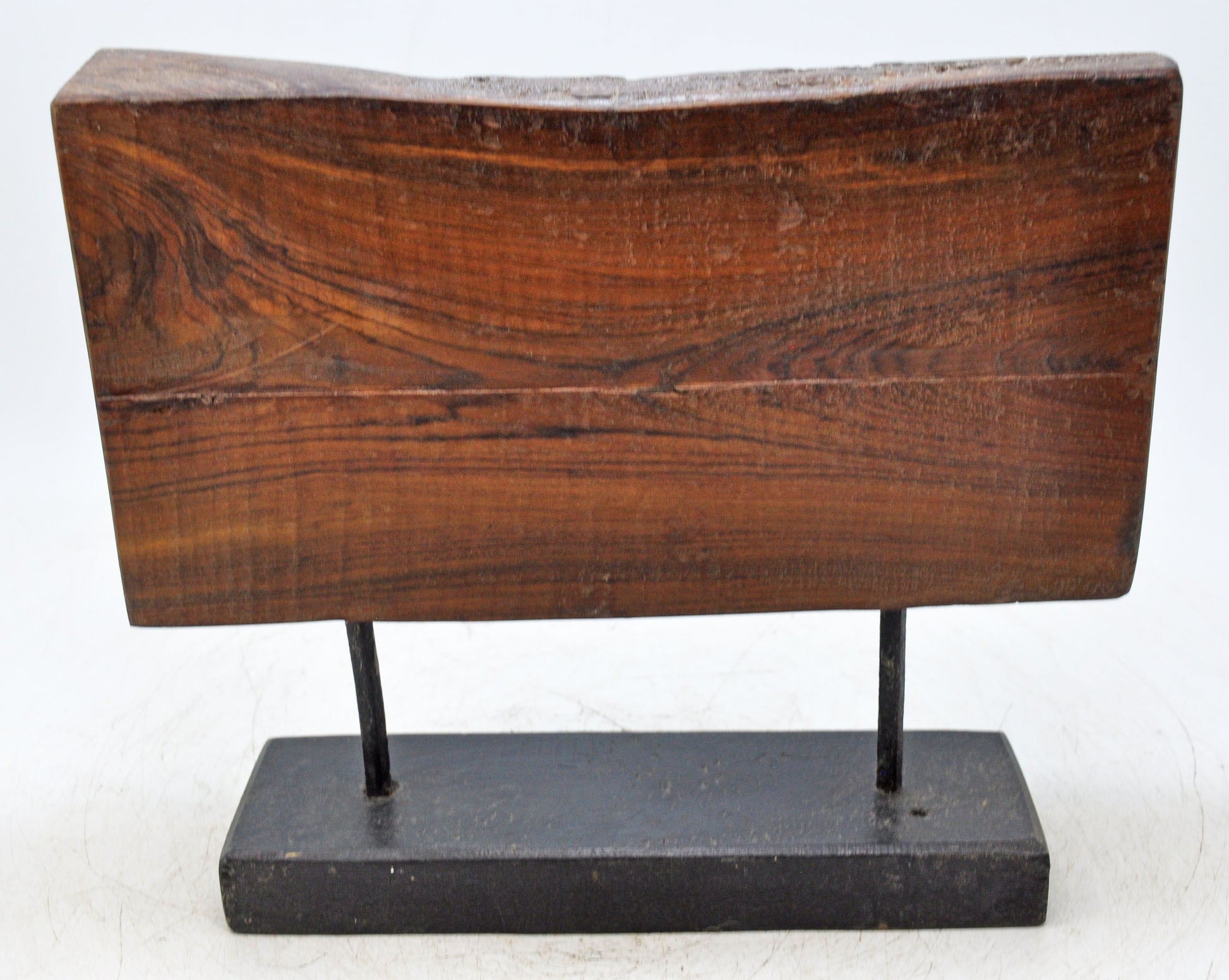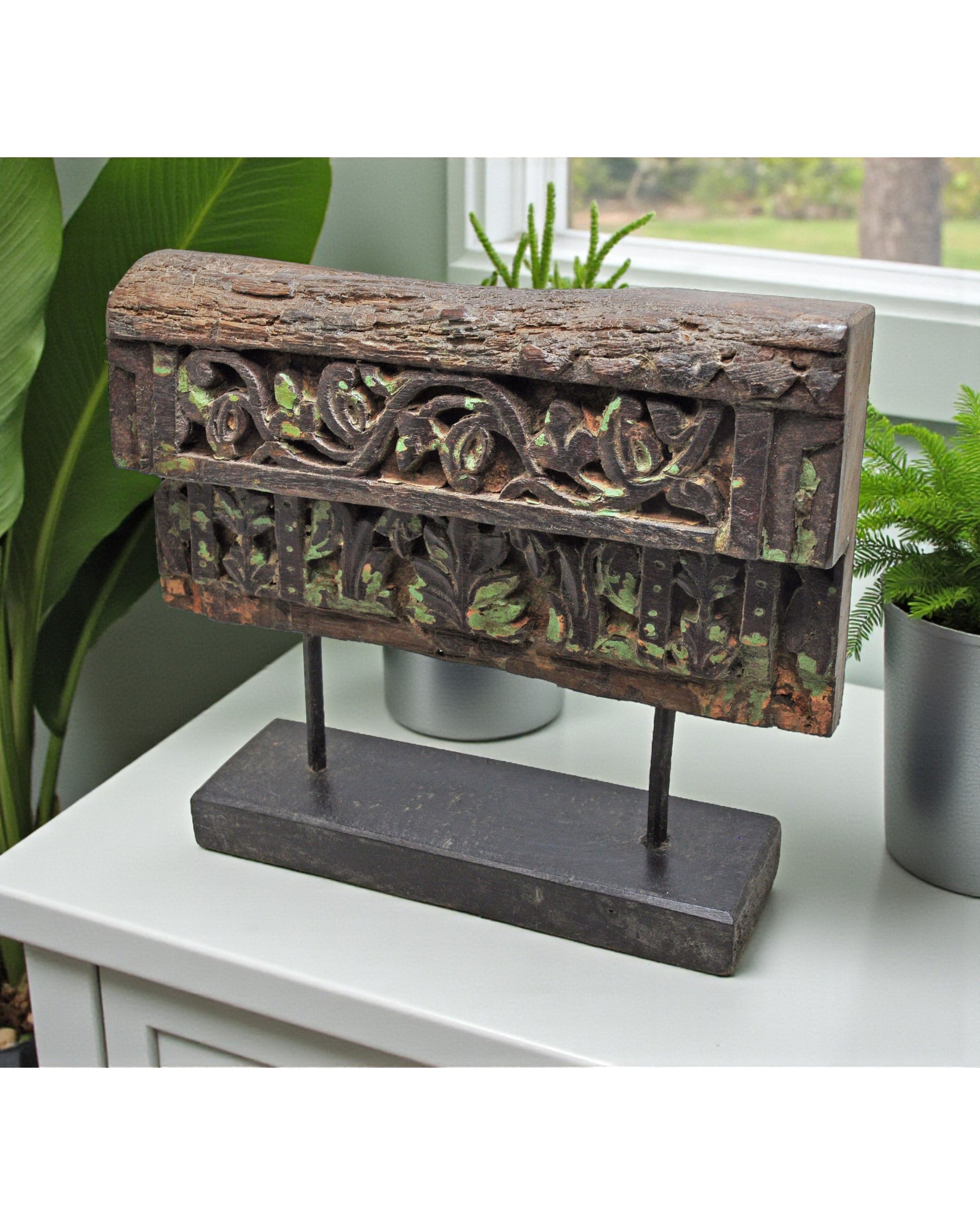 An elegant old wooden plaque featuring a graceful floral carving, shaped entirely by hand with careful precision. The artisan has brought depth to the design through fine cuts and layered detailing, allowing the flowers to appear subtly raised from the surface. Mounted on a stand, it becomes an eye-catching decorative accent for shelves or tabletops. Age has enriched the wood with a naturally deep patina, giving it warmth and character. A beautiful piece of traditional workmanship. Origin India.