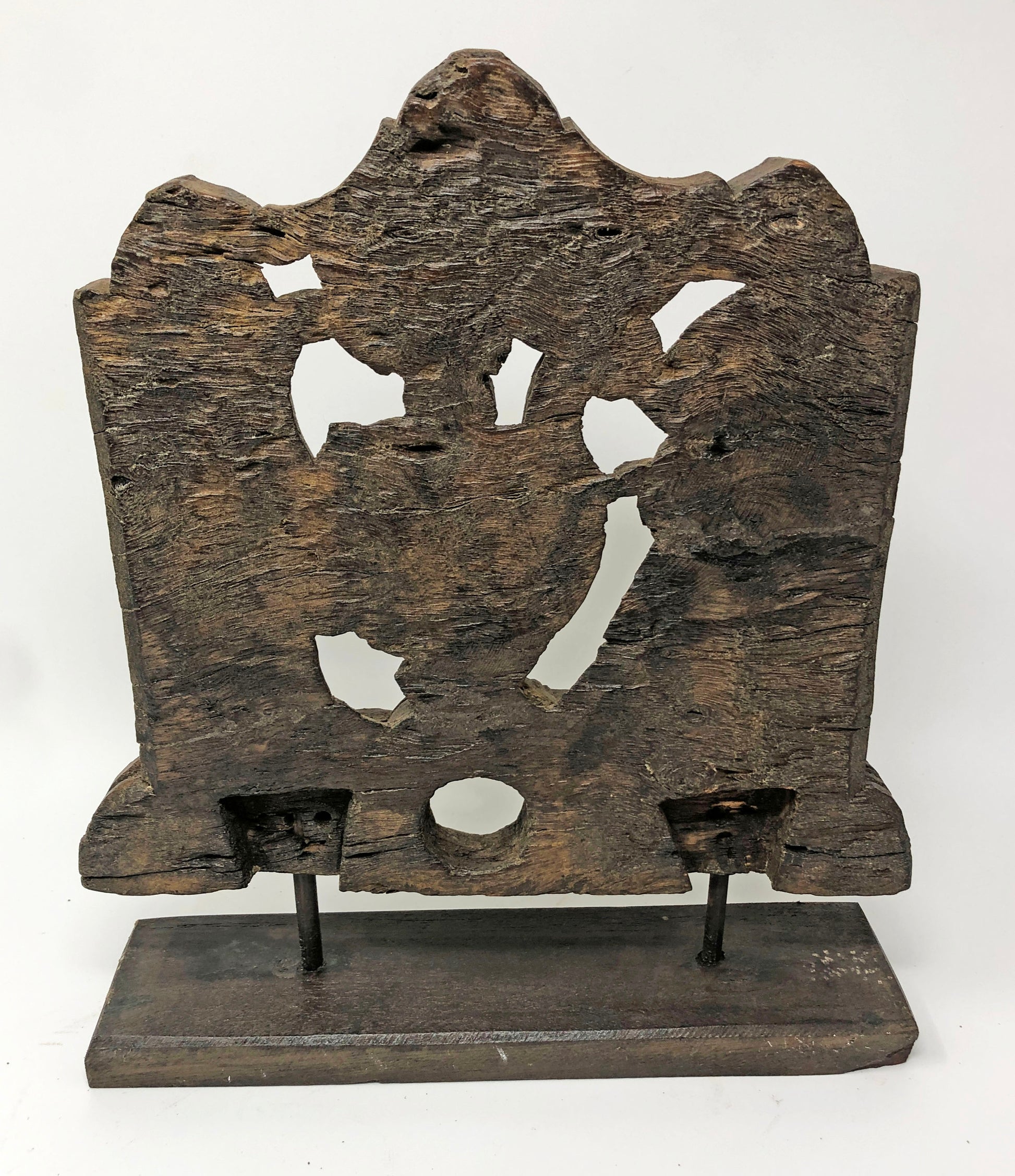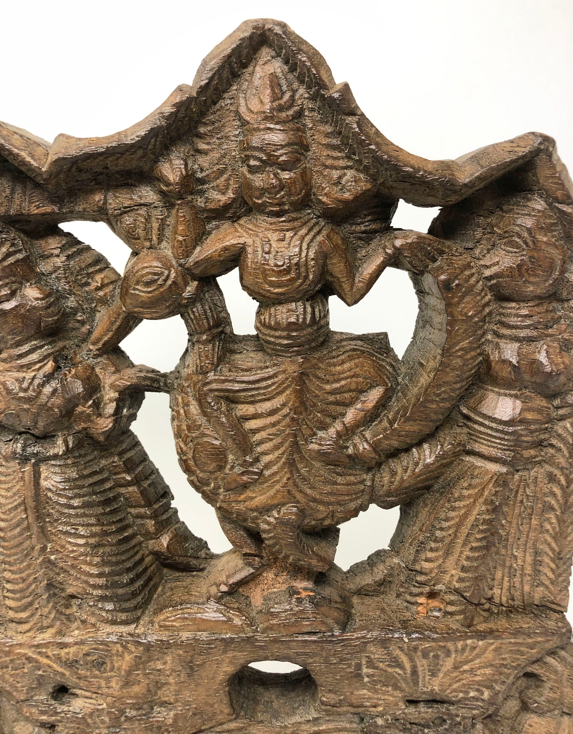 A beautiful old wooden idol / carving of Hindu goddess Saraswati, on her swan mount. Hand carved with very fine details and mounted on a stand for display. Good condition and a rich patina. Origin India.